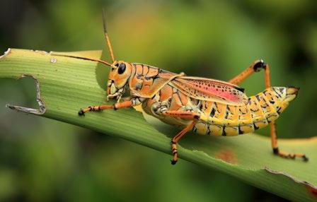 Lubbers grow through five stages, molting their exterior covering each time. Nymphs are almost completely black with red, orange, or yellow thin stripes. Antennal segments and two sets of wings develop over time, the body lengthening, broadening, and hardening. The only real purpose of the wings—pink and rose in color—is to make noise by rubbing them together. In northern Florida, adult lubbers are mostly black with yellow lines. In southern Florida, adults are consistently bright yellow.