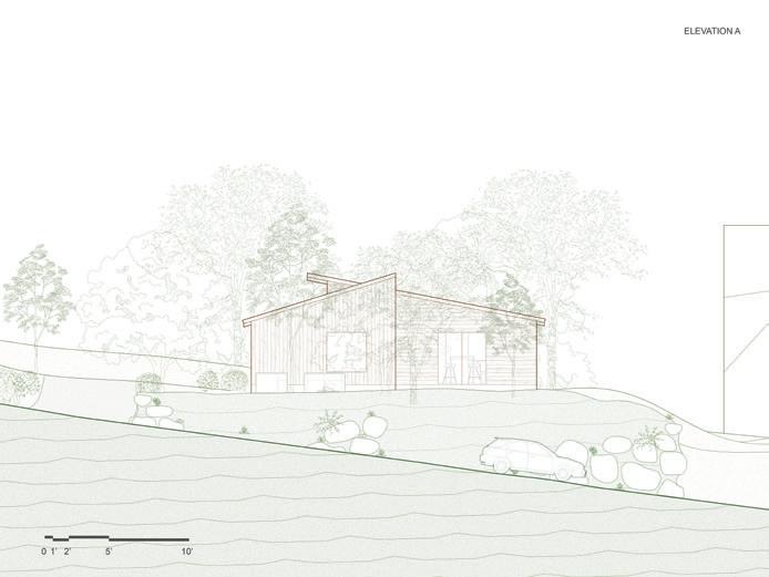 As the preamble to our Material Forest project, we created a series of models and drawings focusing on amphibiosity and building connections to the ground. With an initial precedent analysis of Huma Klabin in Sao Paulo, we analyzed the building in its existing mountainous context, thinking about the structural and experiential connections with the ground. We were excited by the drive-in approach to a garage embedded into the hillside that helped mediate a 6’ height difference between one side of the building and the other.