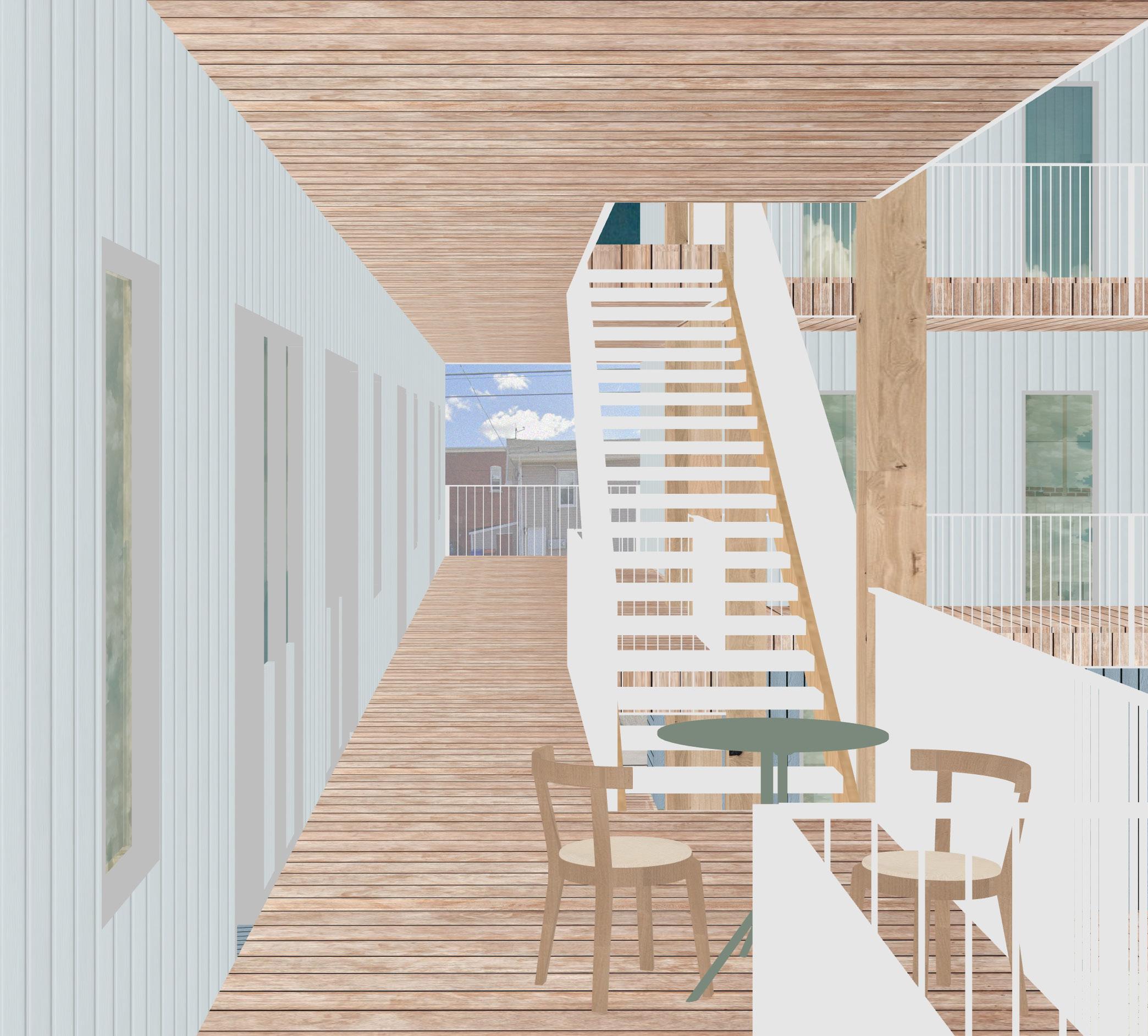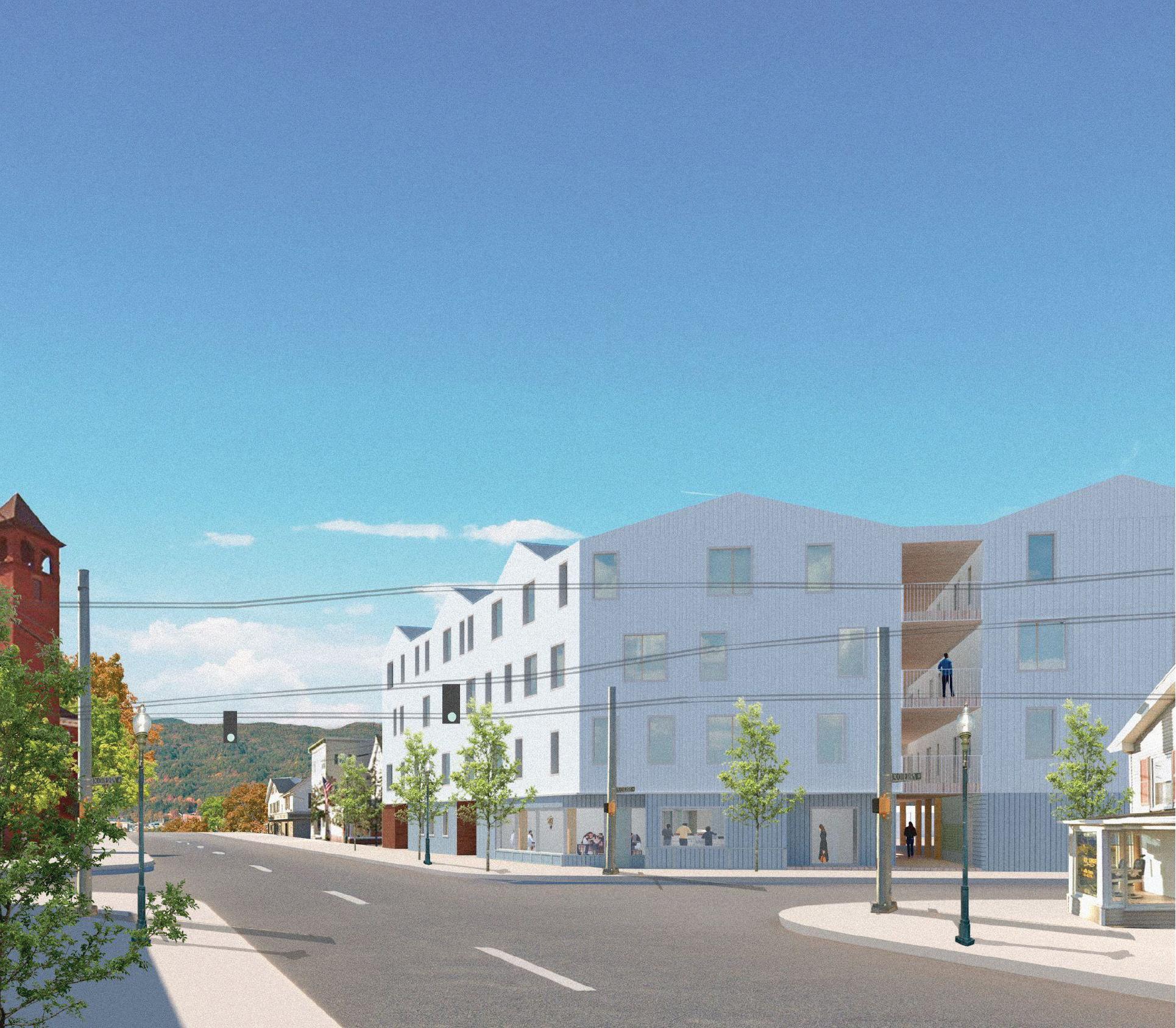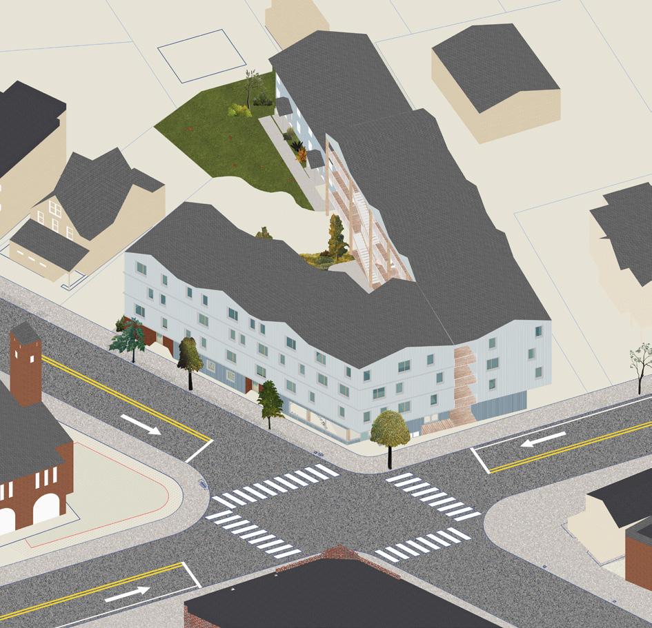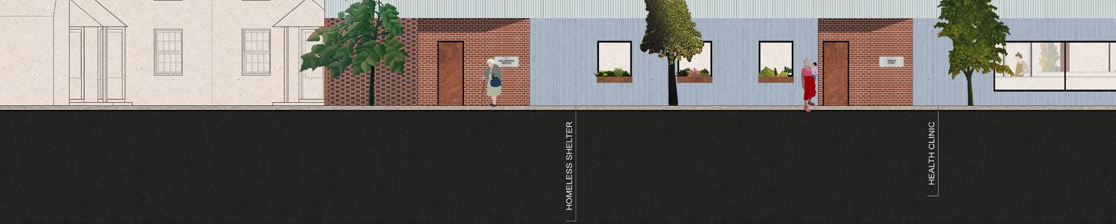 Our design thesis focuses on transparency, community, and mediatin transitions. We want to protect Columbus House clients while connecting them with the larger Wallingford community and town plan to brighten the downtown core, prioritizing spaces that can be useful for inhabitants while doubling as larger community gathering points. Our scheme proposes a shared exterior courtyard, intimate communal spaces, and public programs on the ground floor that serve not only the residents but also larger communities in downtown Wallingford.