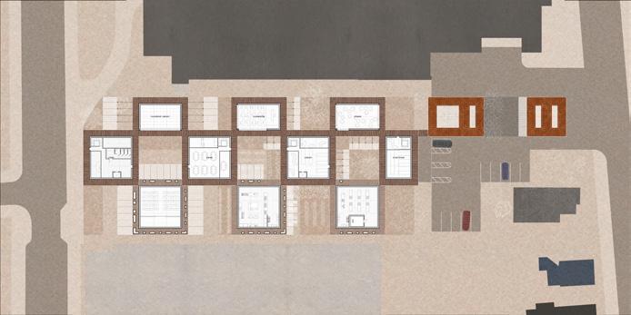 This project is an intervention of the Fair Haven Branch Library sits between a public school and grocery store. The community context shows demand for childcare, food security, and educational resources, three things that exist in situ. My project, then, aims to weave these three elements through the site, creating a mat “gallery district” of alternating exterior and interior spaces.
