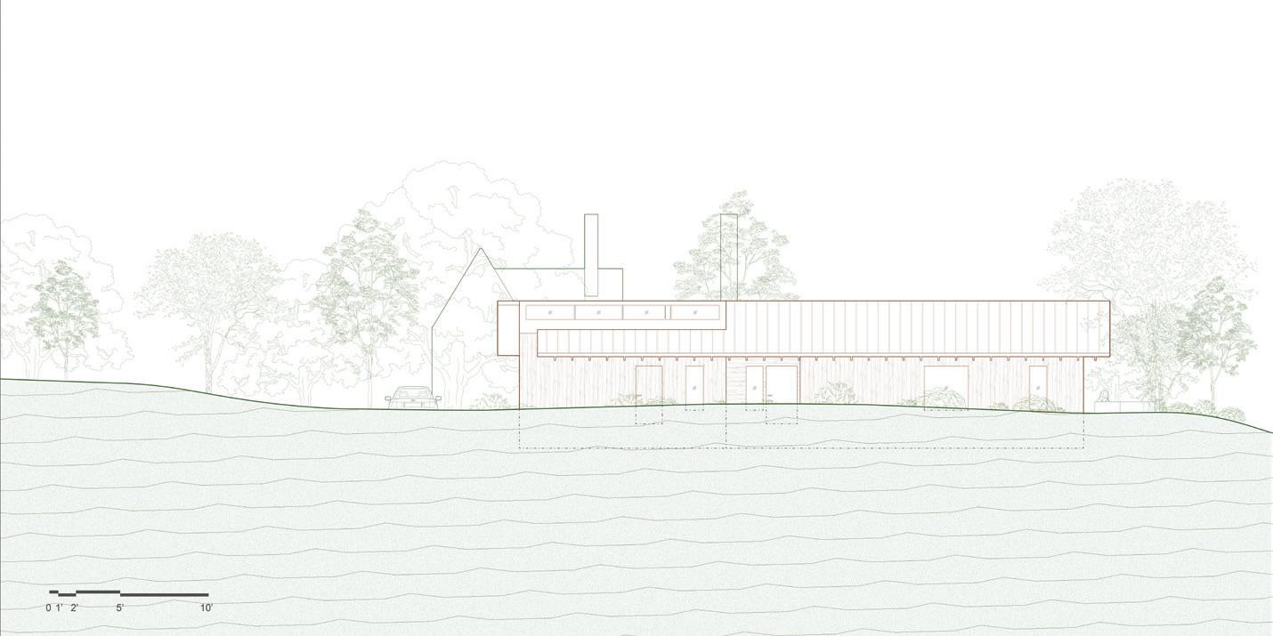 Elevation from street (top left), section looking south through one private wing (top right), elevation from driveway (middle), section through kitchen (bottom).