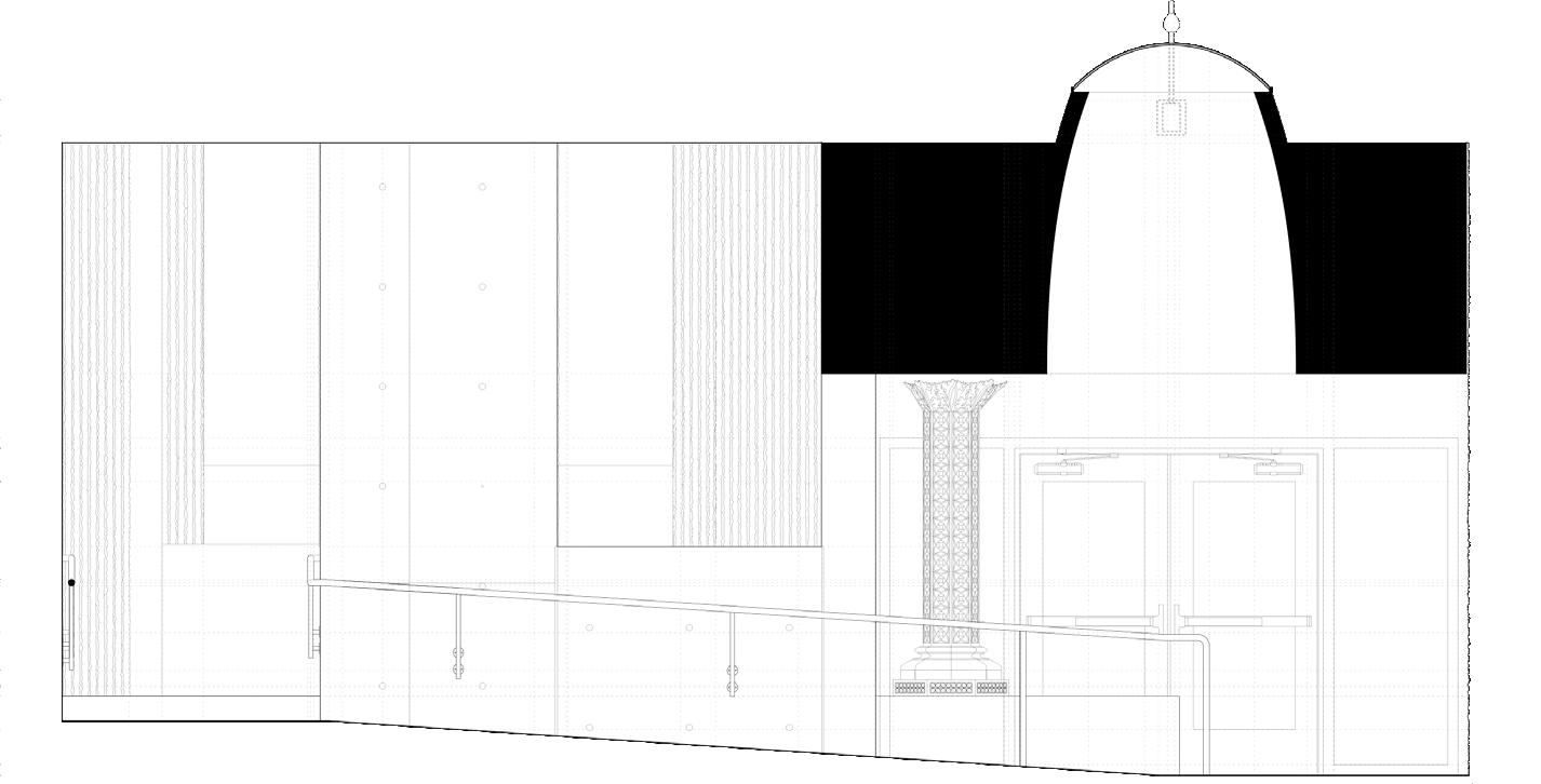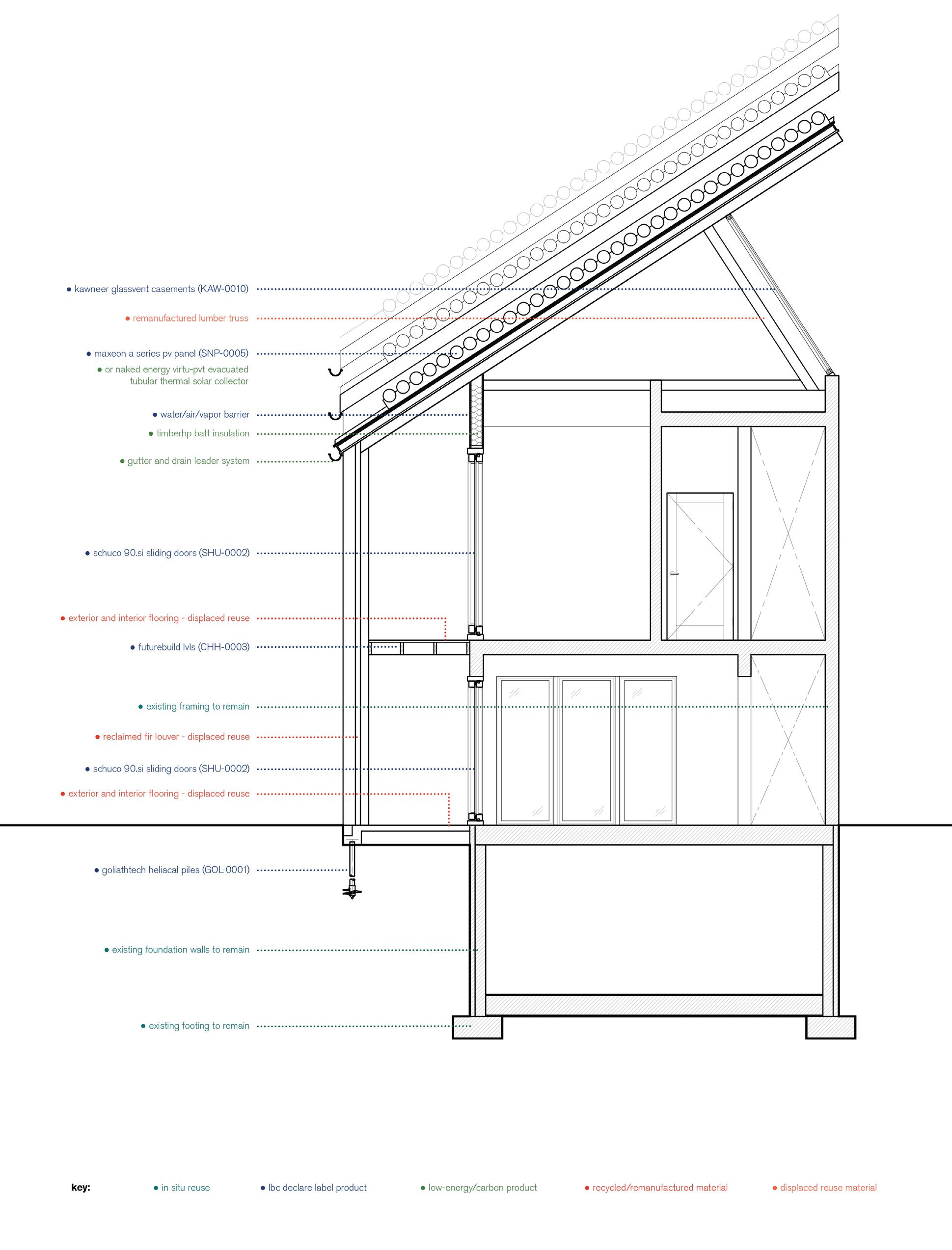 Detail section demonstrating the connection of the roof system to both new walls and existing brick wall-turned-colonnade.