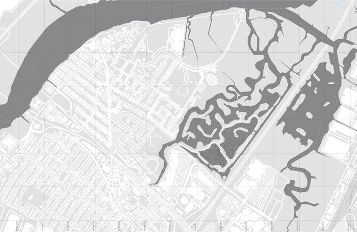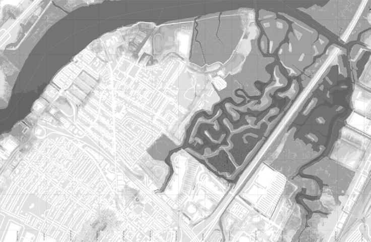 We extensively documented the past, present, and potential futures of the flora, water, and people. By analyzing projected sea level rise and charting what plants could grow where, we come to a proposal of construction and deconstruction over a timeline of 100 years, moving inhabitants of the site to new climateresilient construction in the marsh. Our proposal includes a planting schedule and building phasing such that by the time construction begins, there can be a closed loop of material processing both from both new plant growth as well as salvaged materials from the existing suburban sprawl, adopting housing into the lifecycle of the ecosystem and creating a closed bioeconomy.