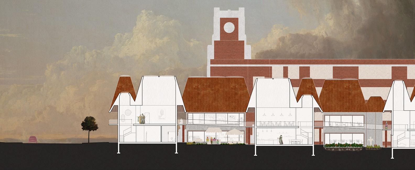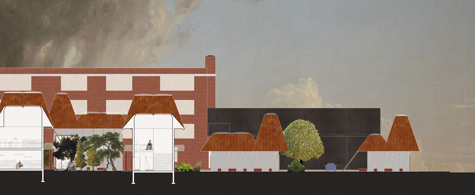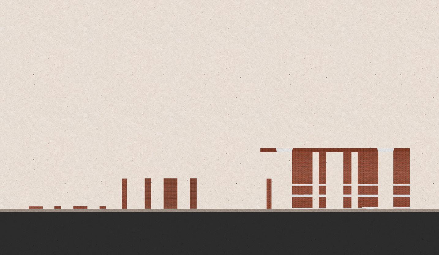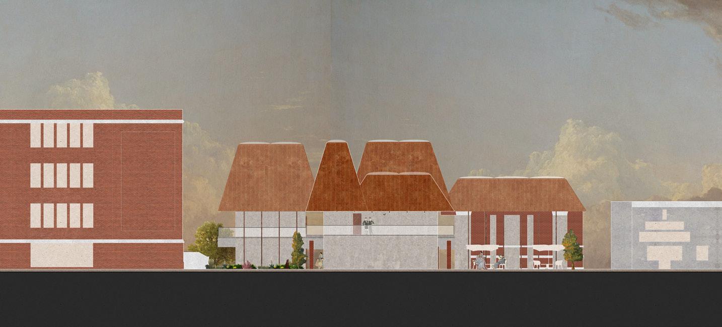 Using a grid derived from the existing library footprint, exterior spaces are typified into “crop rows”, “forest”, and “garden” while interior spaces are for learning, cooking, and eating. Brick is reused (and replicated) from the original building—the existing footprint is surrounded by a mainly intact but hollowed out brick facade that functions as a loggia; further down the site the brickwork becomes columns supporting an exterior walkway; the smallest iteration sees stumps of brick serving as seating around gardens.
