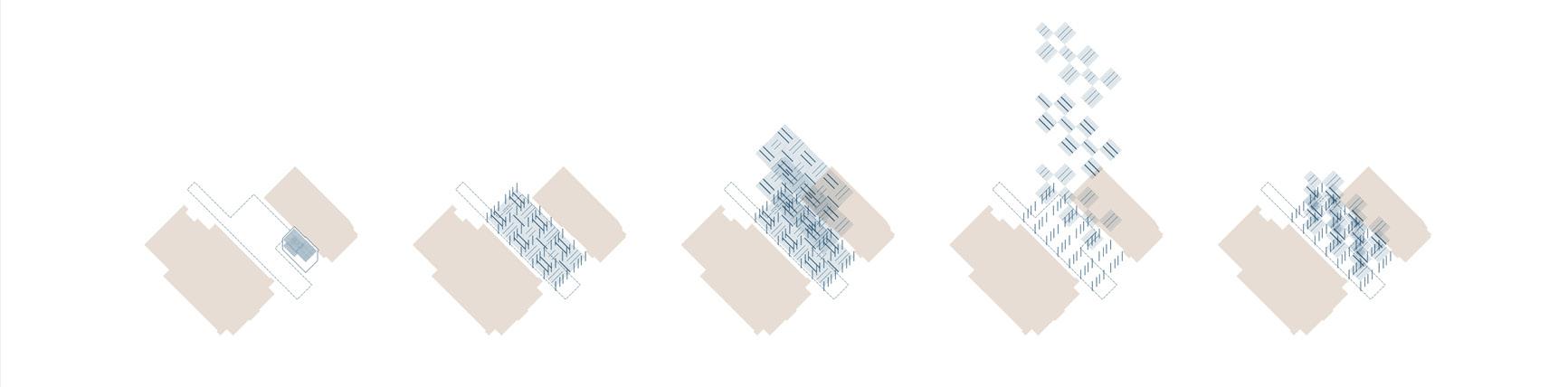 Adaptive reuse diagram showing the grid module derived from the existing library (top), a grid/weaving diagram (middle), and typologies of brick reuse (bottom).