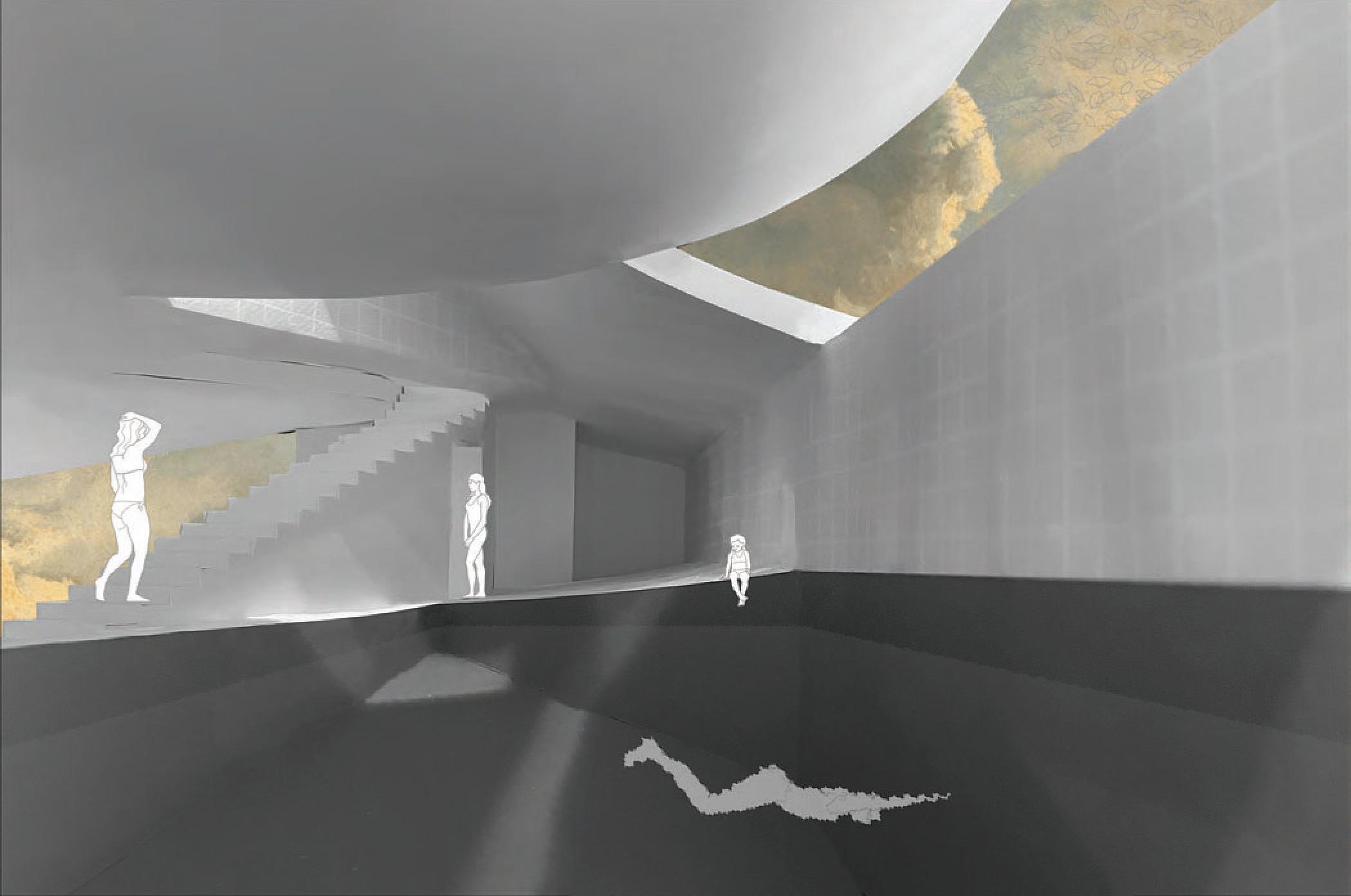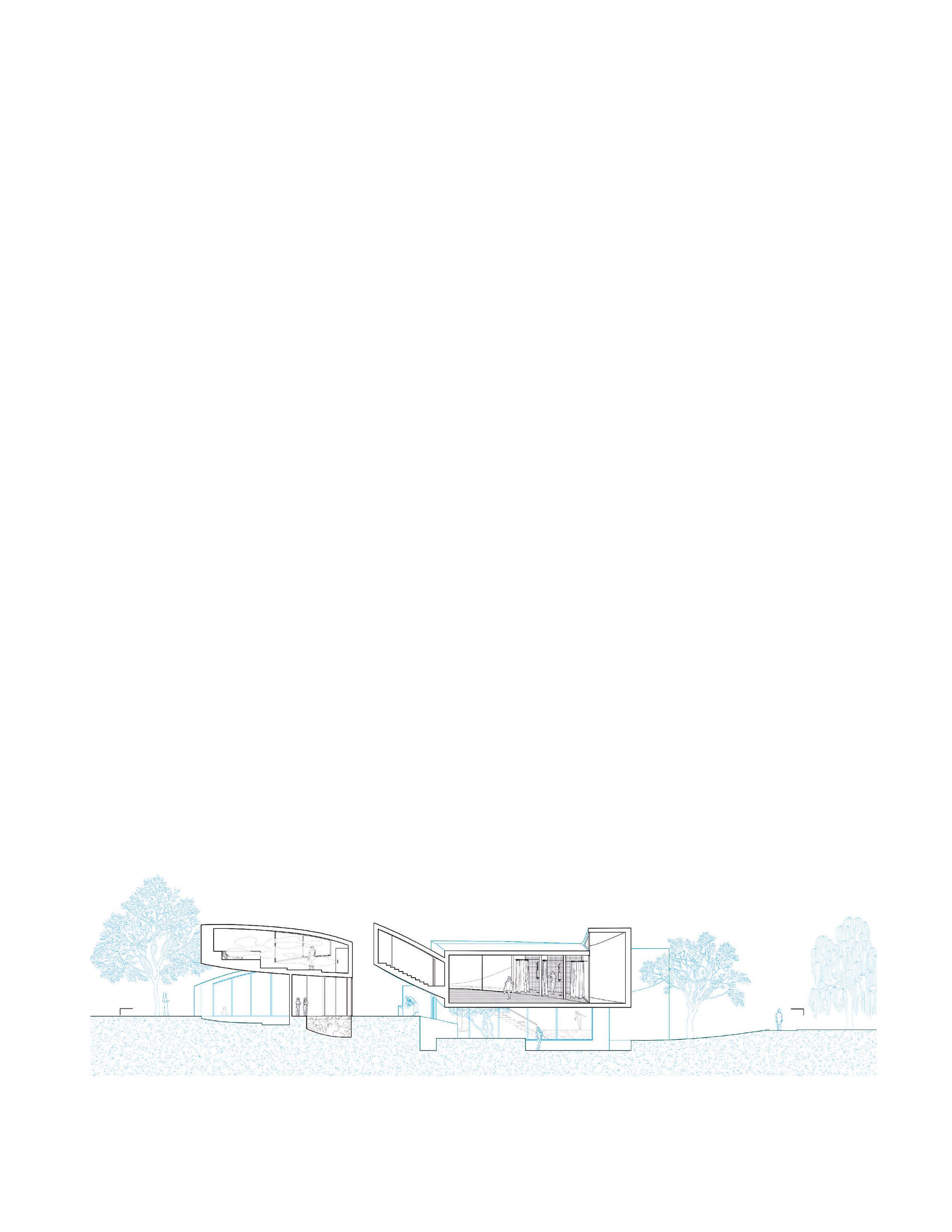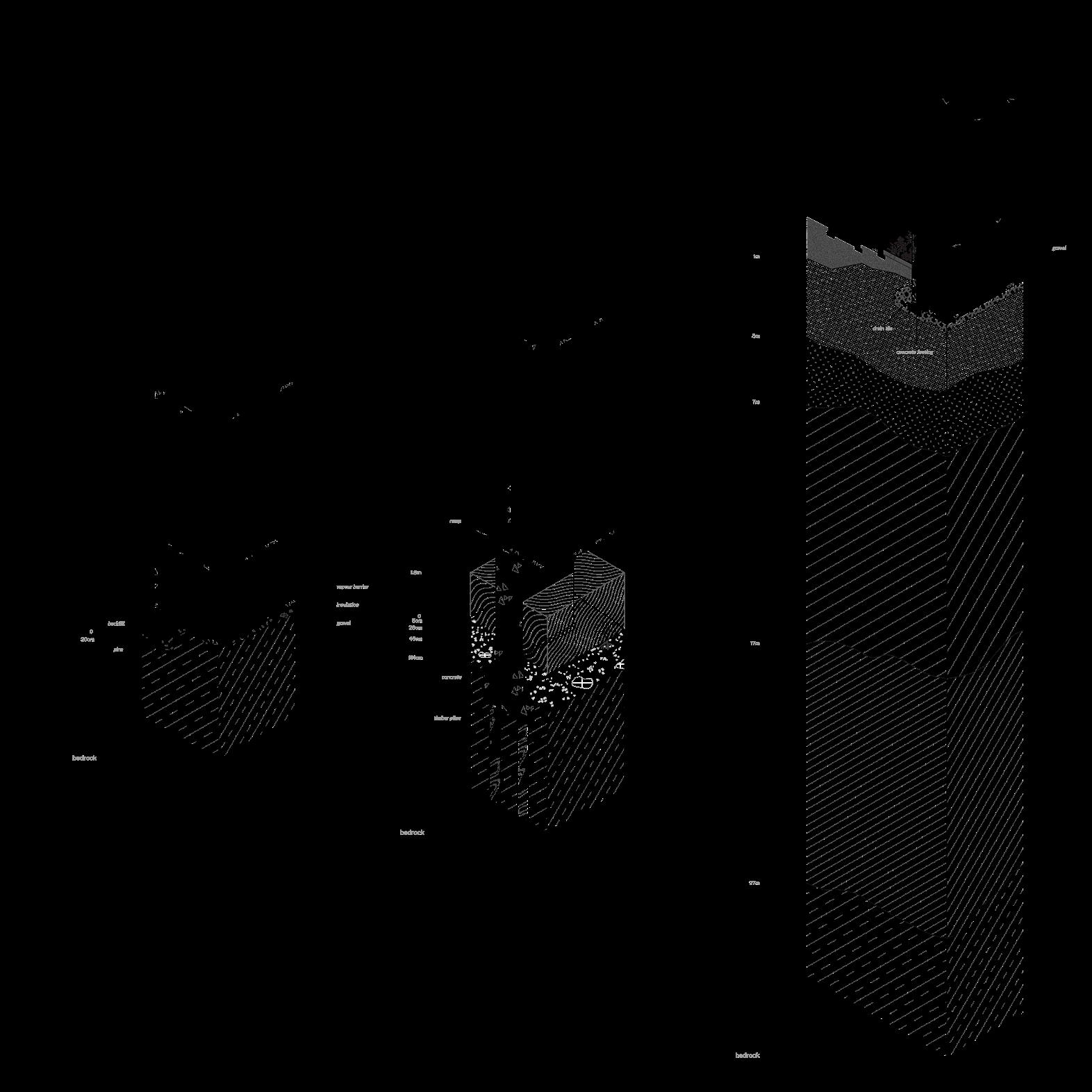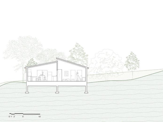 The second transforms the project in an imagined future some 300 years away with significant sea level rise wherein the project becomes something about ancestral caretaking, functioning as a mausoleum of sorts where the ground floor, below the datum of a much higher sea level, is a place of entombment for the dead while the upper level is more temporary housing for grieving families and elderly folks as they cross over to the other side.