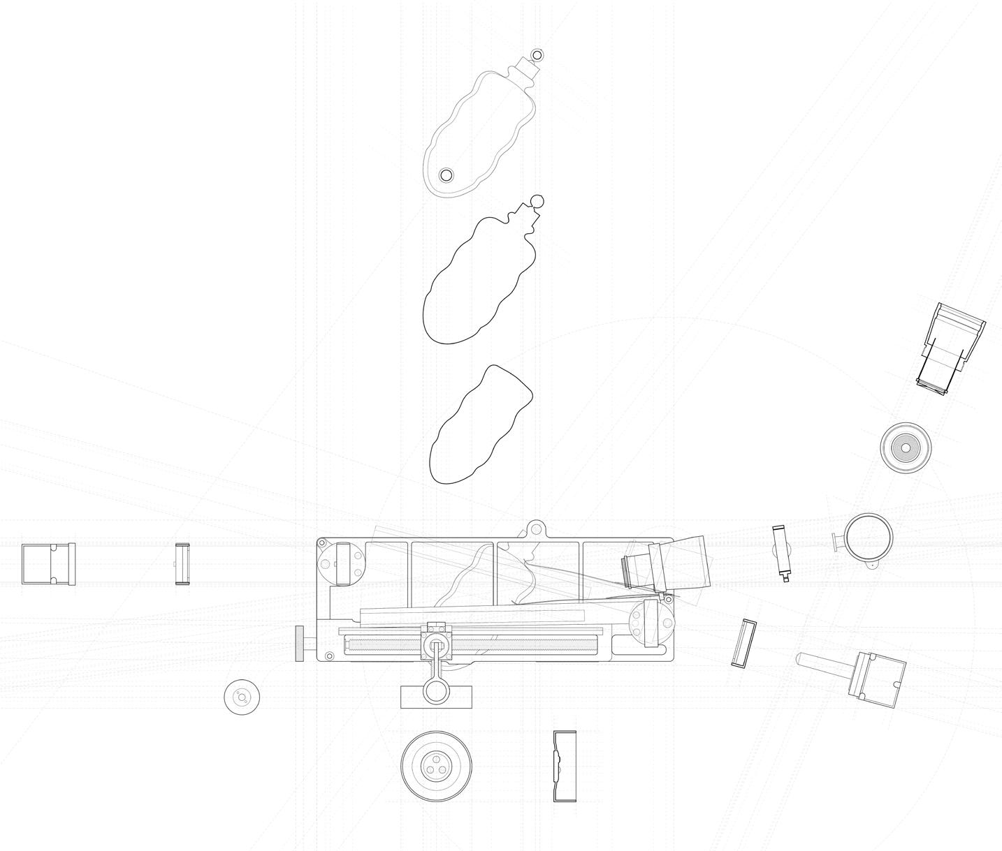Plans and sections cutting through the Foundation Building (above) and the unveiling and unfolding of the model (opposite).