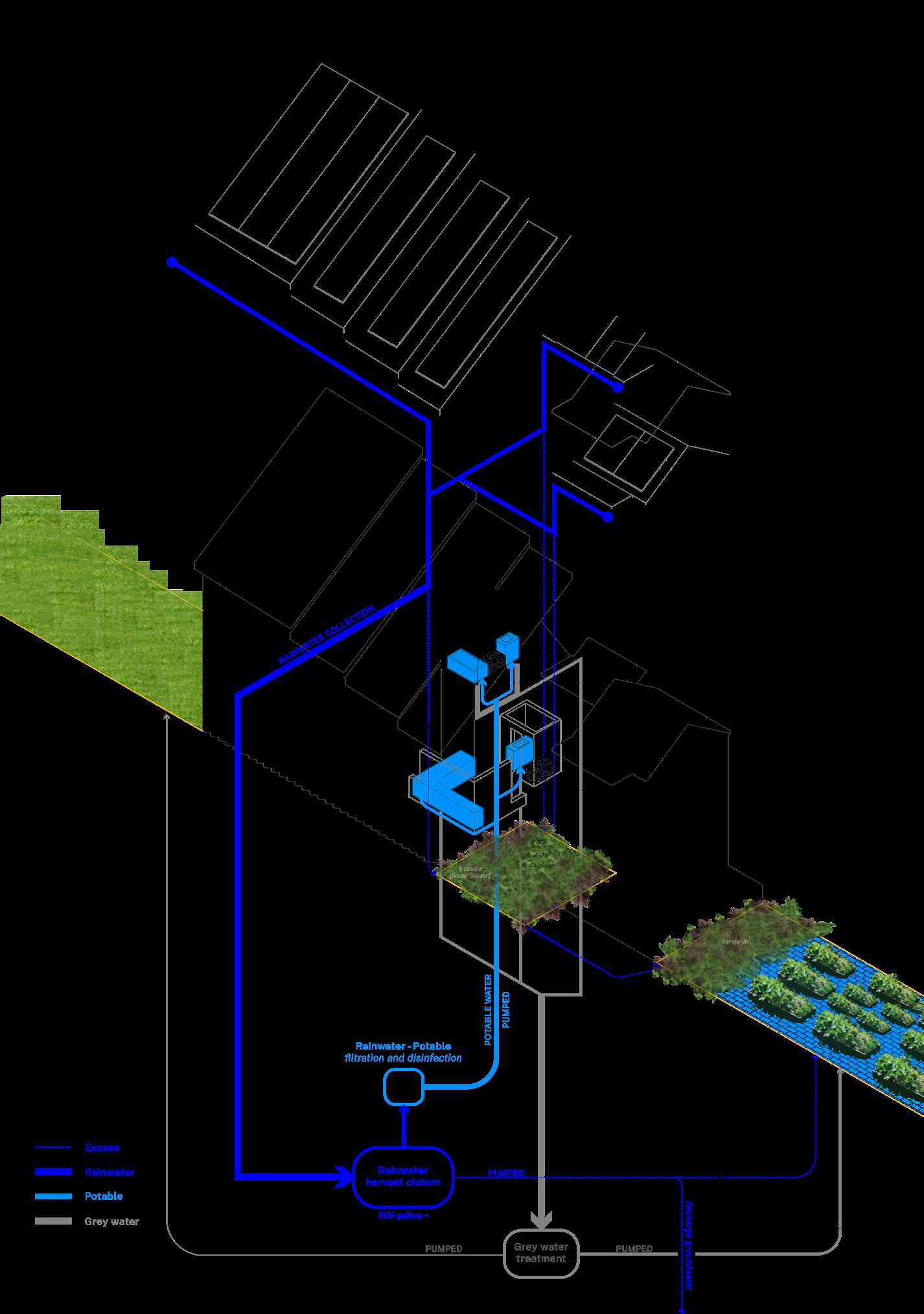 A diagram of the three water systems from collection to potable to greywater to filtration and eventually plant use.