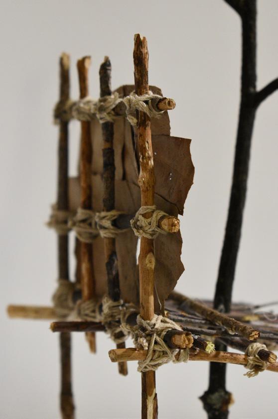 Material study models speculating on treehouse as typology and found material softscape (left), detail of a typical wall, plinth, and Atlantic white cedar stumps as piles