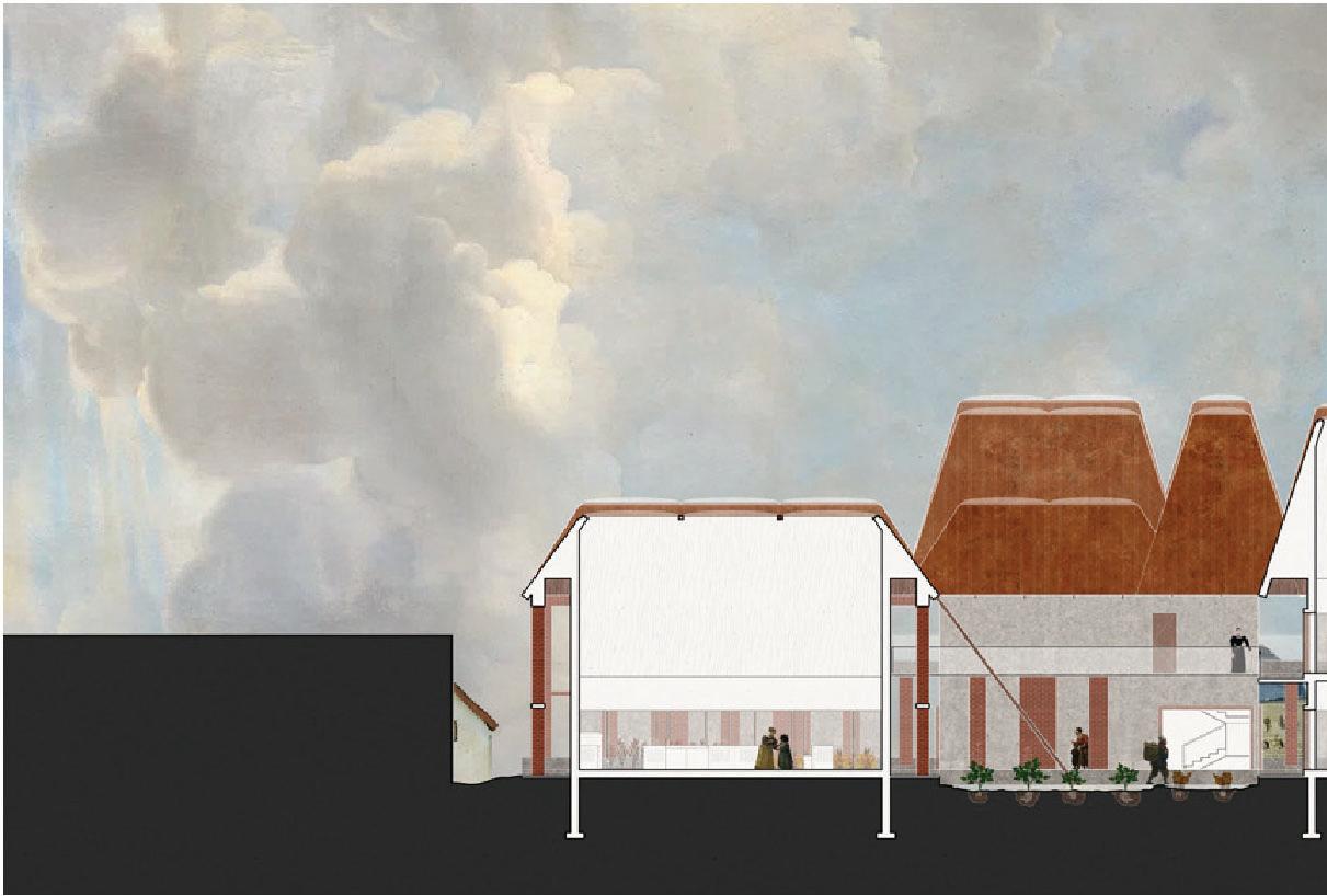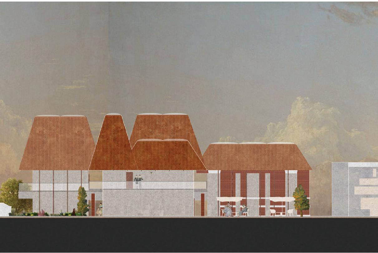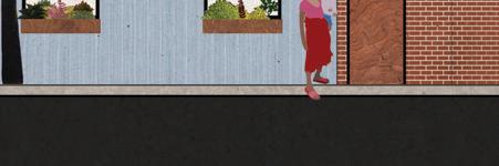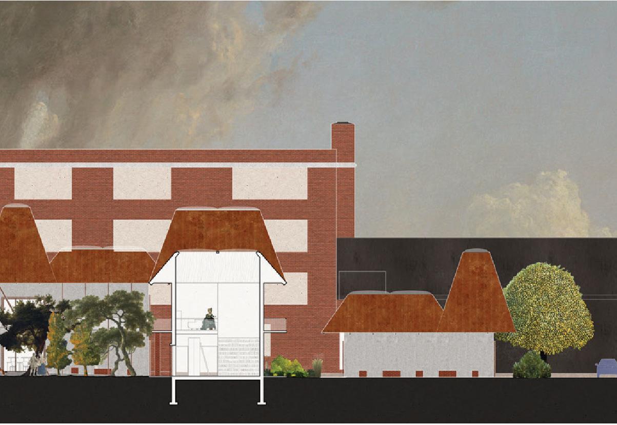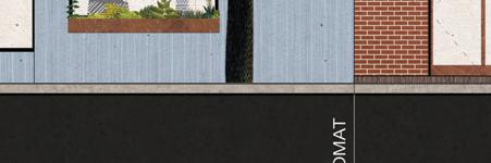 Using a grid derived from the existing library footprint, exterior spaces are typified into “crop rows”, “forest”, and “garden” while interior spaces are for learning, cooking, and eating. Brick is reused (and replicated) from the original building—the existing footprint is surrounded by a mainly intact but hollowed out brick facade that functions as a loggia, column, or seating. Zooming out to the neighborhood scale, the same one way one might stop by the “forest” to read after visiting the library or the communal kitchen after visiting the “crop rows”, community members can stop by the project after picking up their kids from school, or come by to cook with groceries from next door.