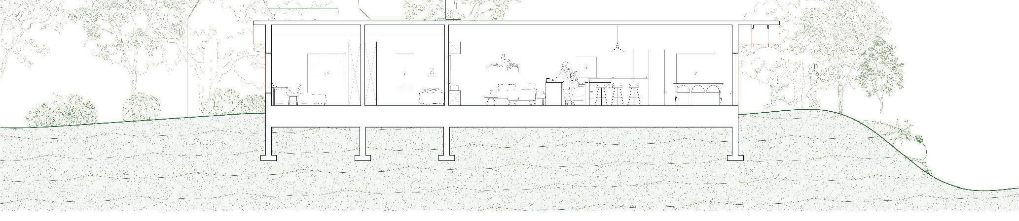 As the gateway into the community to be built over the next few years, we’ve positioned our house as a low, inconspicuous building that serves almost as a wall along the community driveway. The low profile of our house, in play with the terrain, allows privacy to both our tenants and their neighbors.