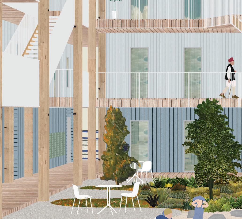 This project proposes intergenerational caretaking in two time scales. The first, in the present, is elderly intergenerational living, taking into account the prevalence of intergenerational households in POC communities but dignifying both elders and their kids by providing them with tangential living spaces that provide some degree of separation.