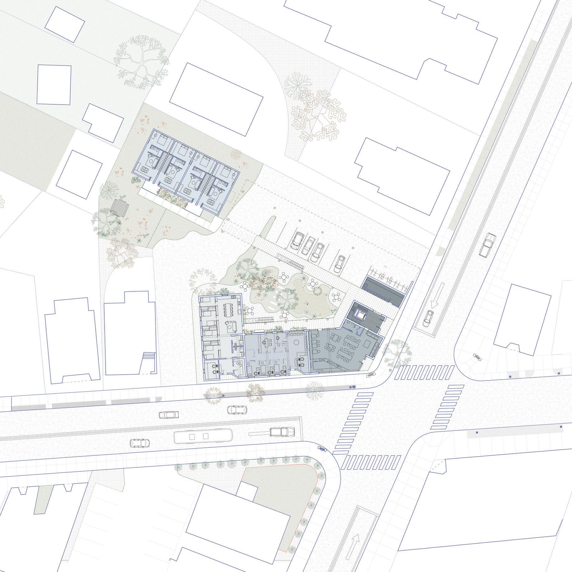 Our design thesis focuses on transparency, community, and mediatin transitions. We wanted to protect Columbus House clients while connecting them with the larger Wallingford community and town plan to brighten the downtown core. We prioritize spaces that can be useful for inhabitants while doubling as larger community gathering points. Our scheme proposes a shared exterior courtyard, intimate communal spaces, and public programs on the ground floor that serve not only the residents but also larger communities in downtown Wallingford.