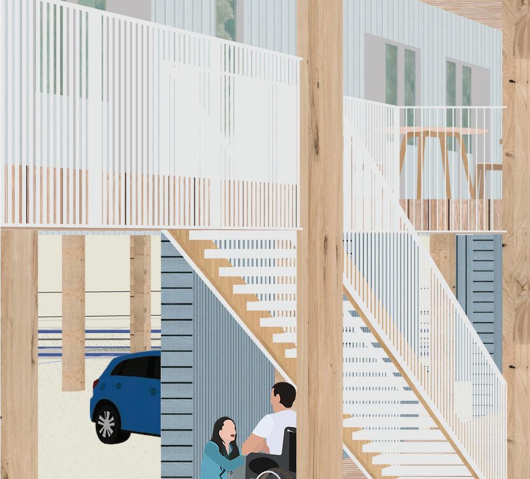 Our foundational values in approaching this project are dignity and respect. We believe strongly that although the parameters of this project necessitate a shared house, each family should have a right to privacy and comfort to a degree that allows a separation from their work and home. We’ve approached this proposal with a “hub and spoke” method where each family has a private wing with individual living spaces and differing views, joined together by a larger communal kitchen and lounge.