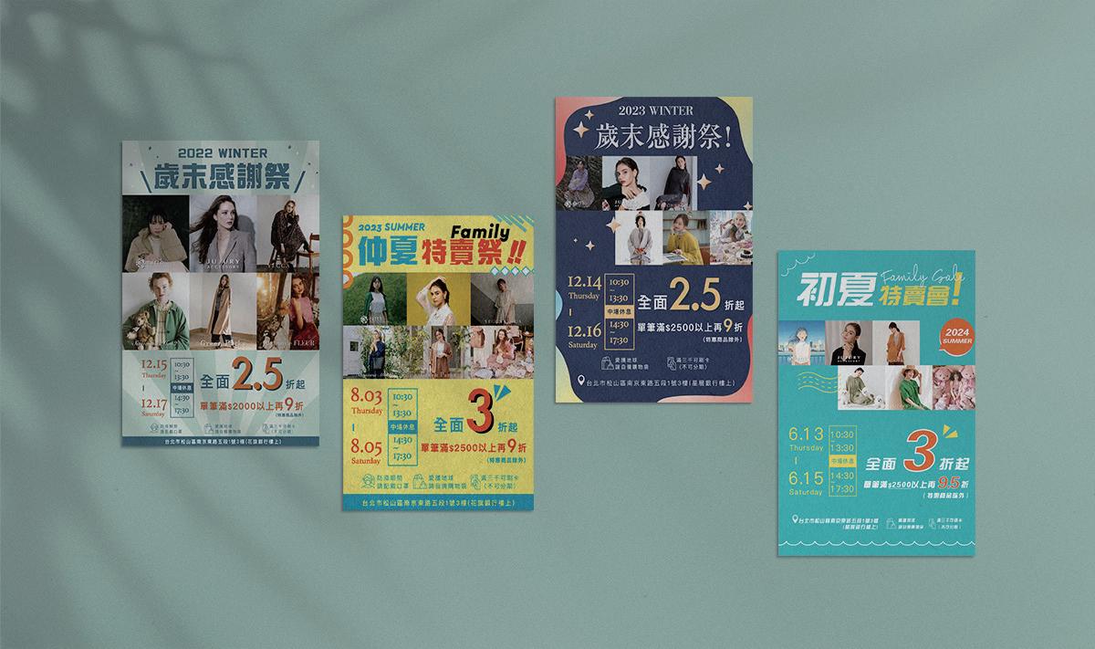 特別活動會有不同印刷製作物的需求,例如開幕、聯名系列、節慶等等, 設計人員會配合公司需求討論並製作各類印刷物品。
