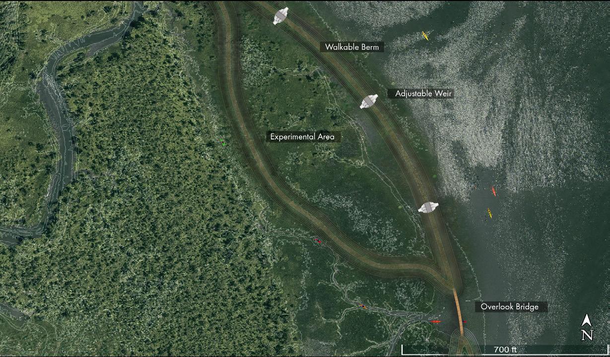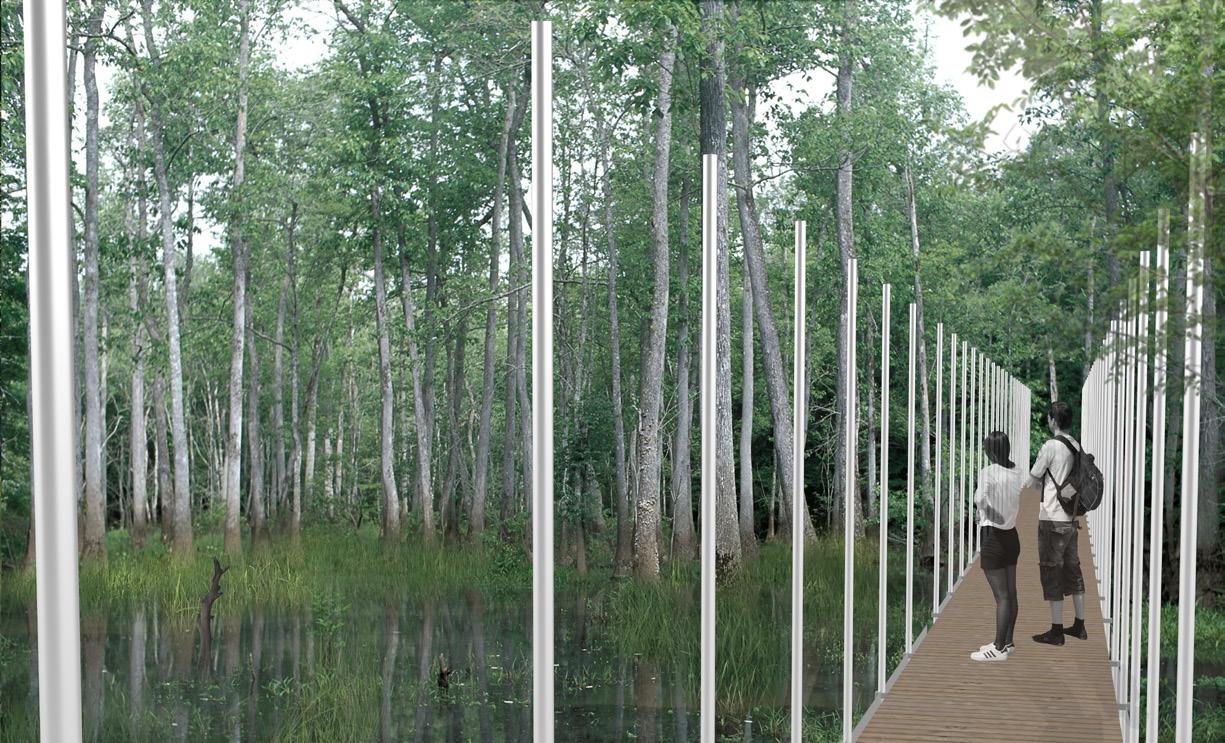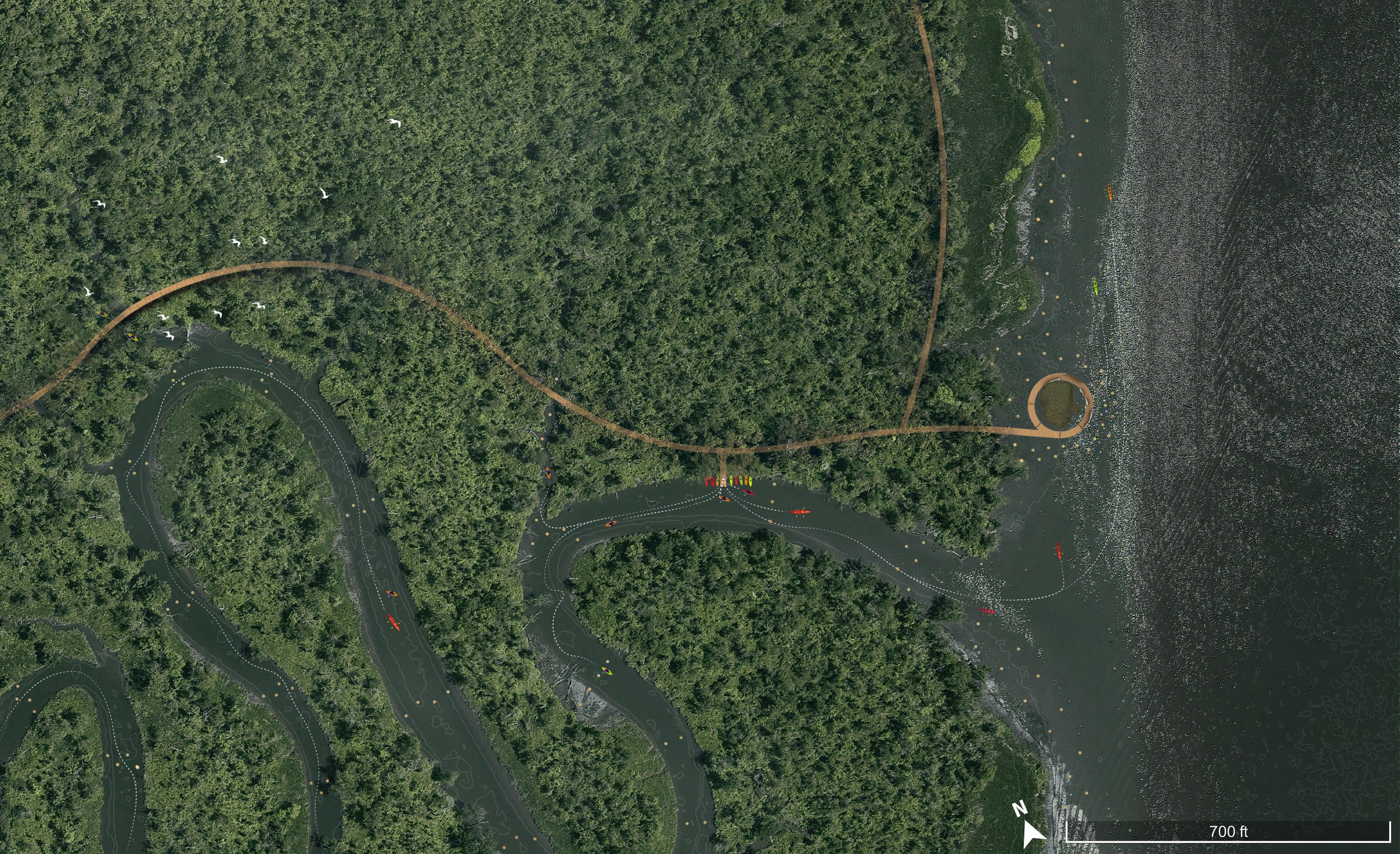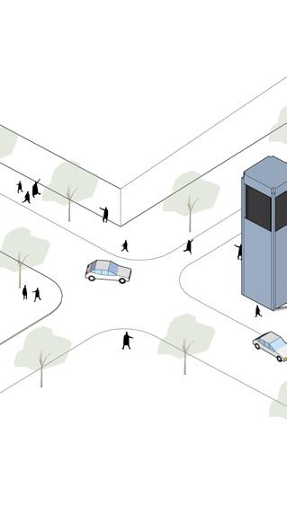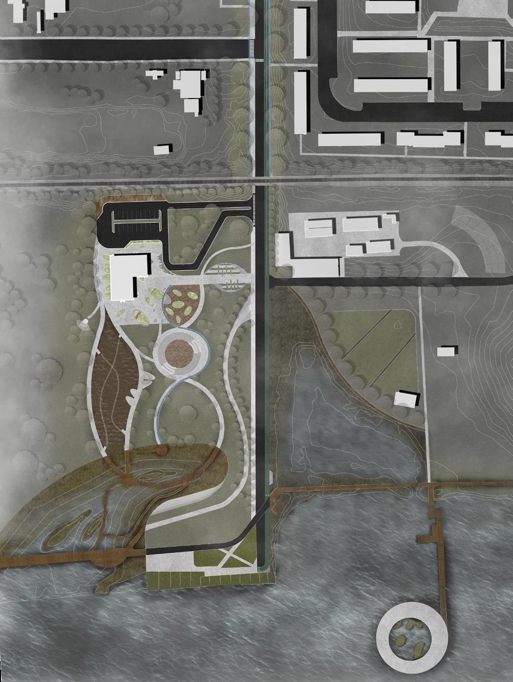 Circulation Tree Vegetation View Sound Multiple entrances for different groups of people. 90% area is covered with fast growth and depolluting trees 60% area is covered with lawn and depolluting plants 50’ wind tower is visible to observe from far away Stimulating