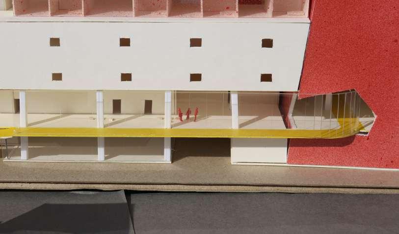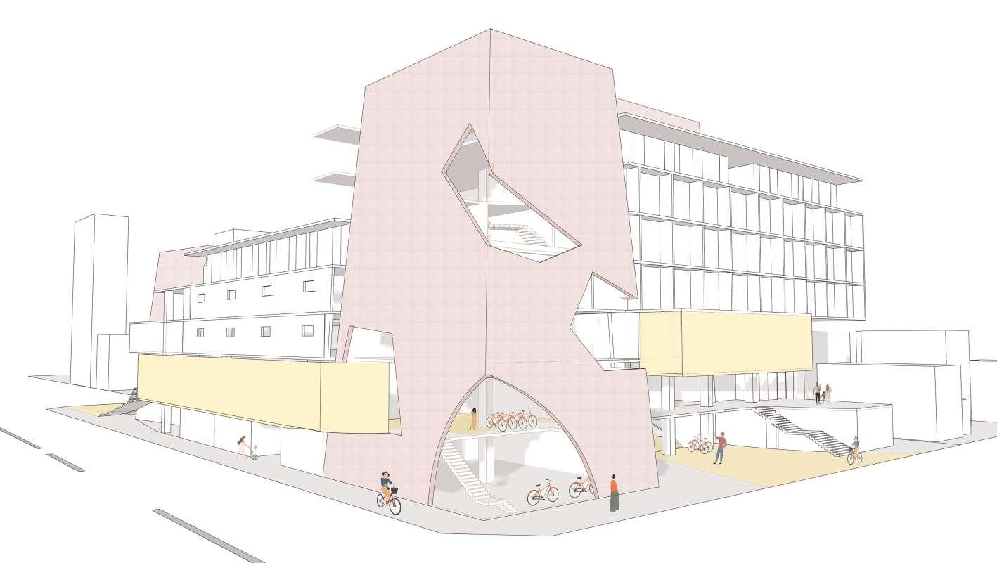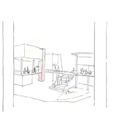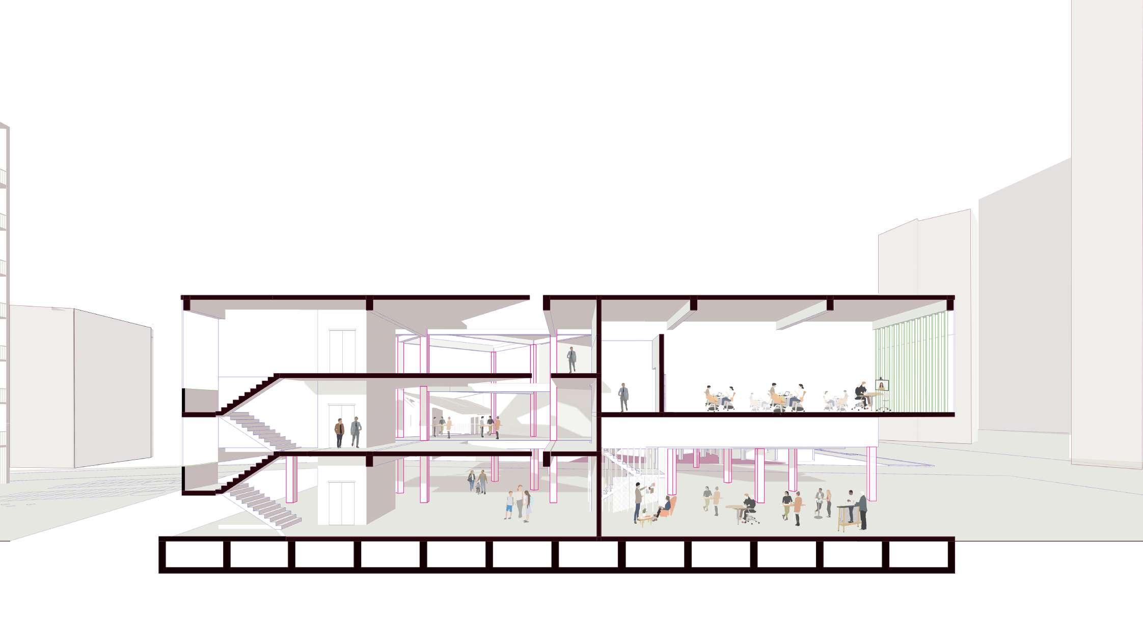 To maximize the potential of various bicycle-related activities in my design, I have created three converging cores embedded within different volumes. These cores, made of Corten steel, have varying openings based on the visibility of the bicycle activities taking place within. From a distance, citizens can witness dynamic activities by looking through these openings and enter these spaces via the converging cores.