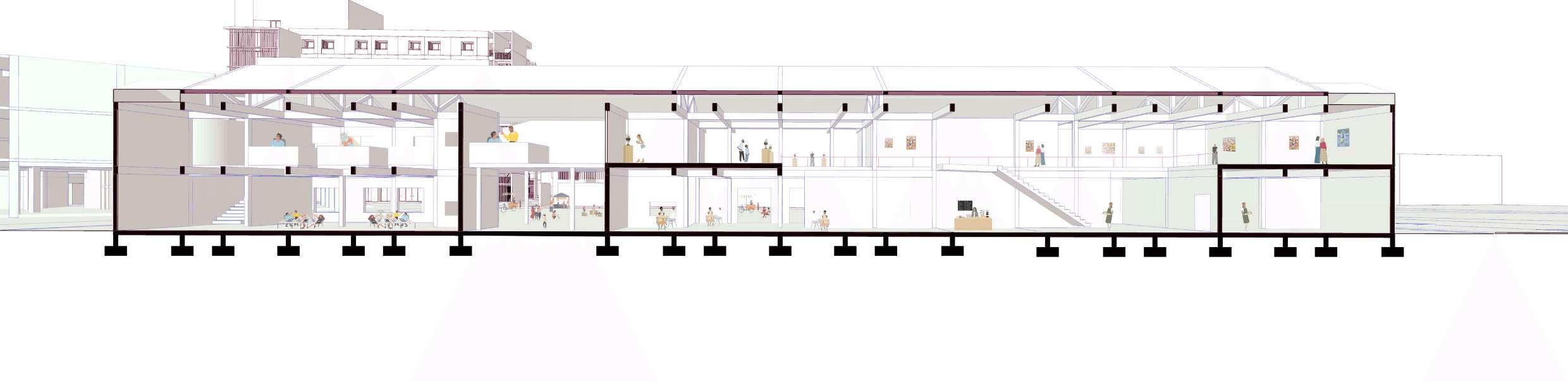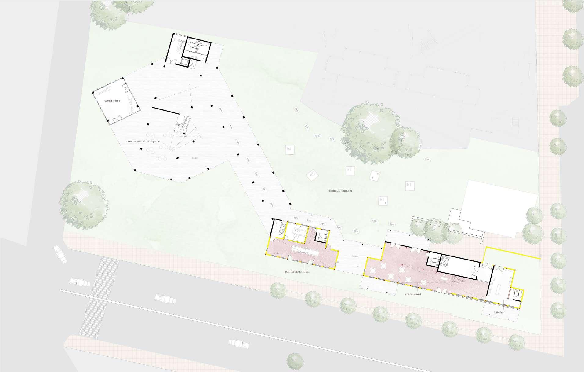 On the ground floor, I will leave as much open space as possible, providing a community plaza that can accommodate various activities. At the same time, there will be a workshop that offers handmade lessons for residents. On weekdays, students can share their expertise and communicate with the public, and on holidays, the market will be open to the public.