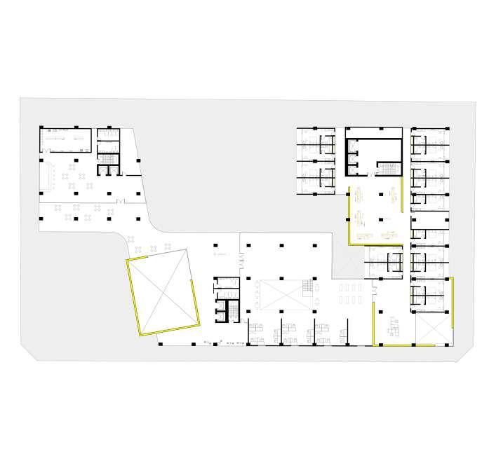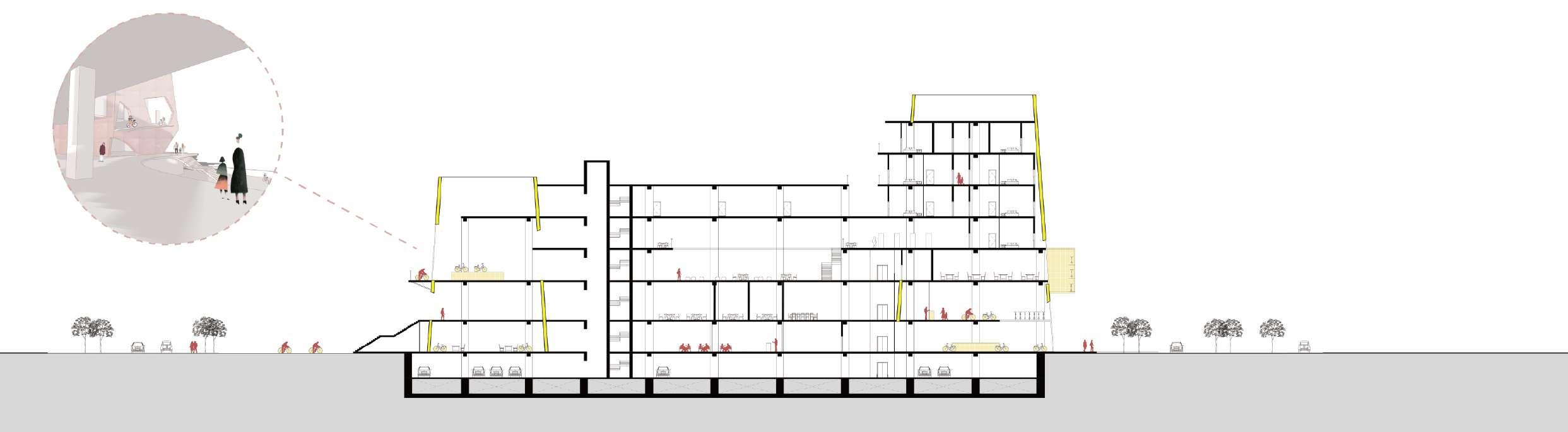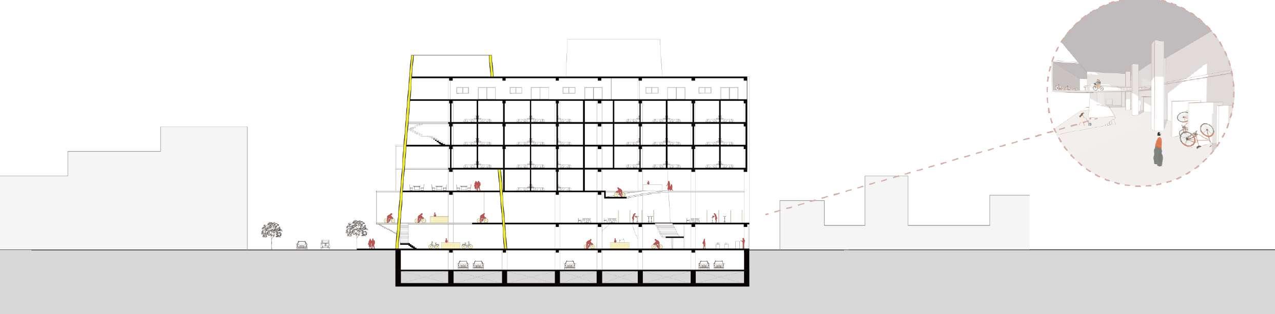 On the ground floor, I create bike lounge bars along the east-west axis that corresponds to urban open spaces. Tourists from other cities can leisurely explore the city on a bicycle and take a break at the lounge bars, while office workers can grab a cup of coffee before starting their workday. People with different purposes can meet each other in this area.