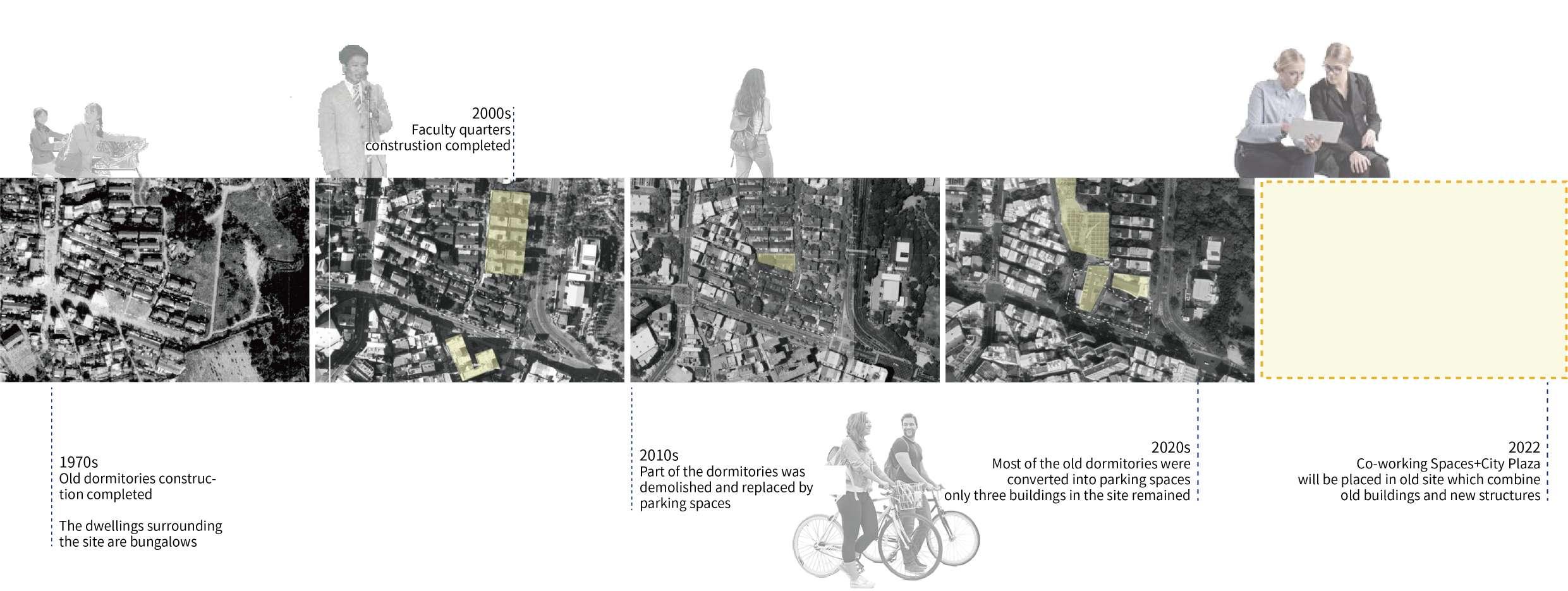 Observing the site from a historical perspective, the functions of the old dormitories have become unsuitable due to the evolution of times, while the axis has kept changing.