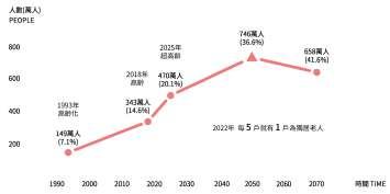 根據聯合國的預測, 2050 年世界上六分之一的人口將達到 65 歲或以上 。台灣已在 2018年邁入高齡社會,扶養比逐年提高,年長者照顧年長者已為常態。獨居年長者 的照護需求越來越高,長照系統成為未來發展的重點。 According to the 2019 World Population Prospects, by 2050, one in six people in the world will be over age 65. Taiwan was an aging society by 2018. Meanwhile, the dependency ratio increases year after year. Elderly people need to take care of themselves. The demand for homecare increases. Long-term care system will be priority in the future.