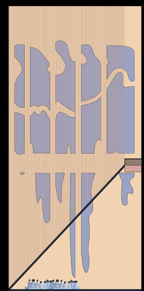 The entire building is meant to be made of mass timber. The building is meant to be supoorted by timber columns, hidden inside of the arches that are present throughout the entirity of the structure. The arches are meant to create a unifying experince throught the building while highlighting the material. Mass timber would allow for the building to be more environmentally friendly in the long run, and with additions of water-collecting stations on the roof and solar panels, the building could achieve net zero energy after a few years.