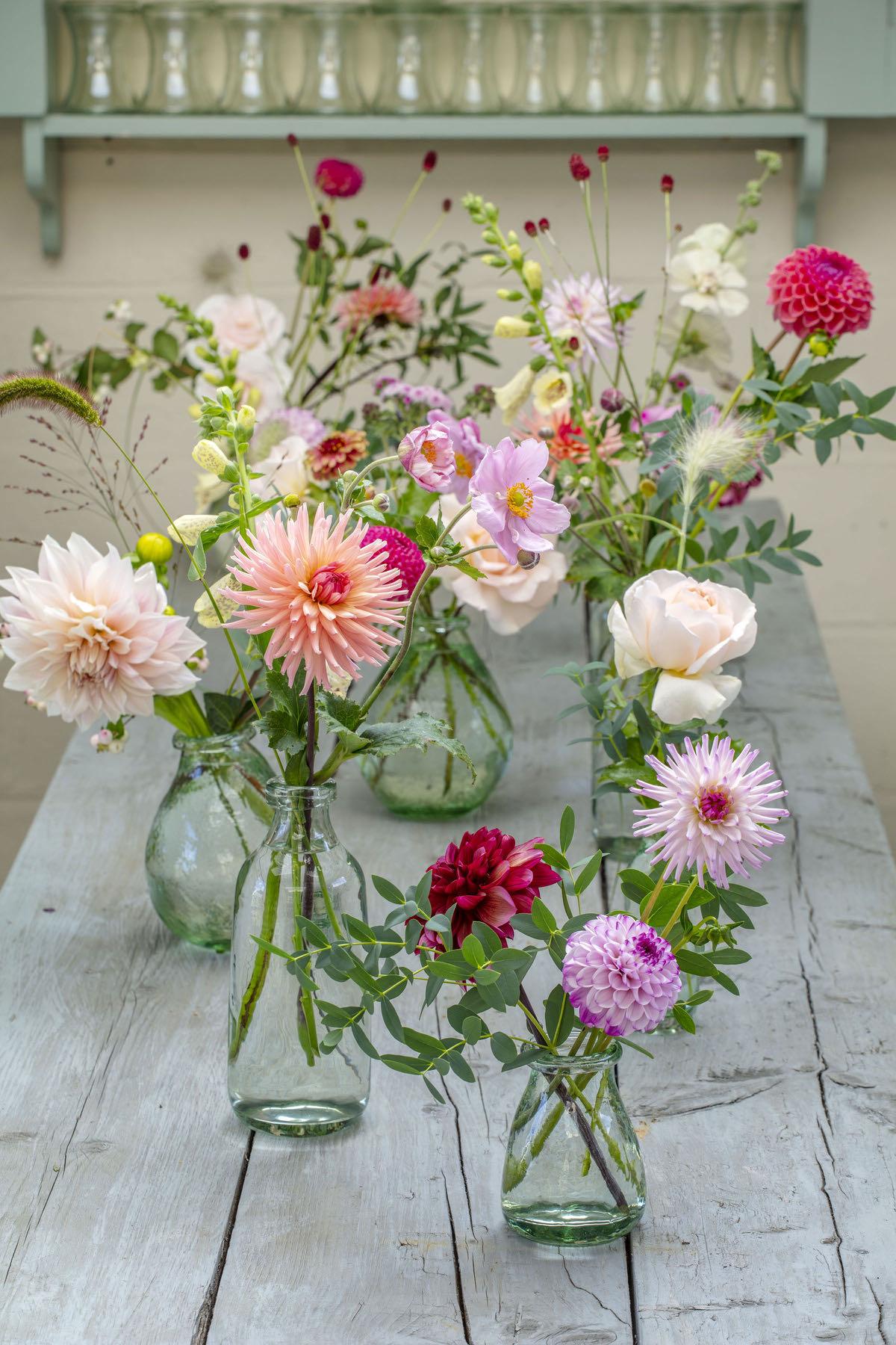 A scattering or cluster of five small glass or ceramic vases and bottles can be remarkably effective and is ideal for a ten person table.