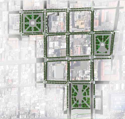 Implementar vegetación y luminarias alrededor de calles para generar la red que vincula los parques. Mediante ello se lograrán espacios seguros y confortables para generar una ciudad caminable.