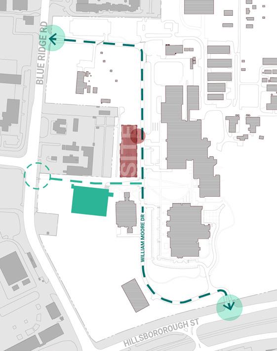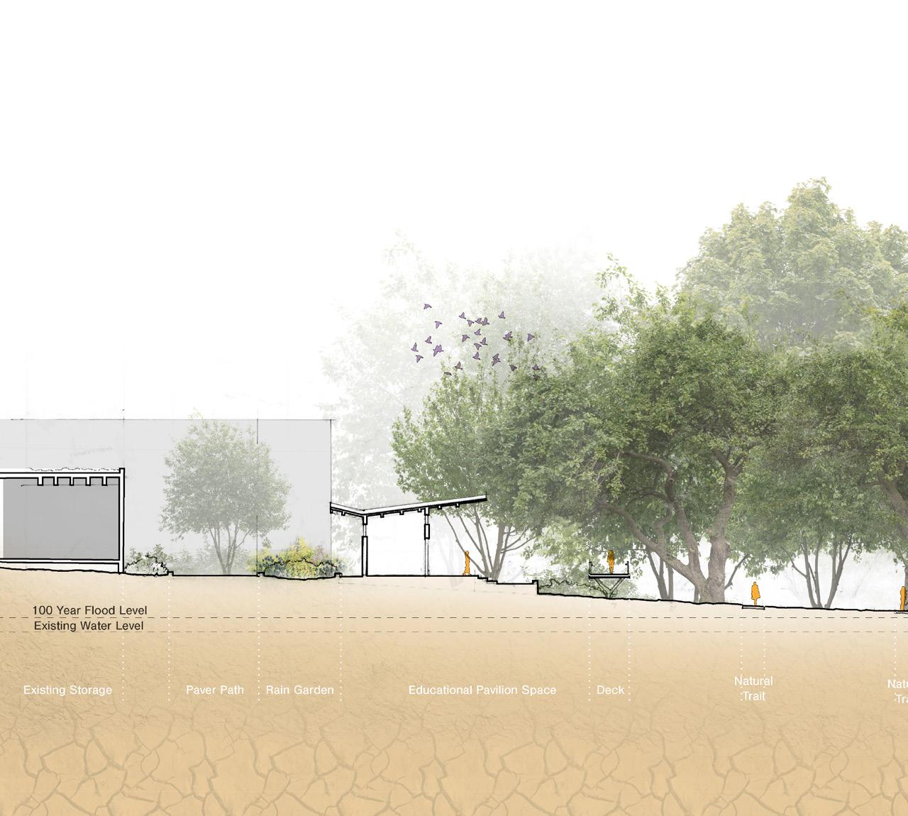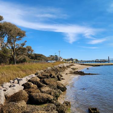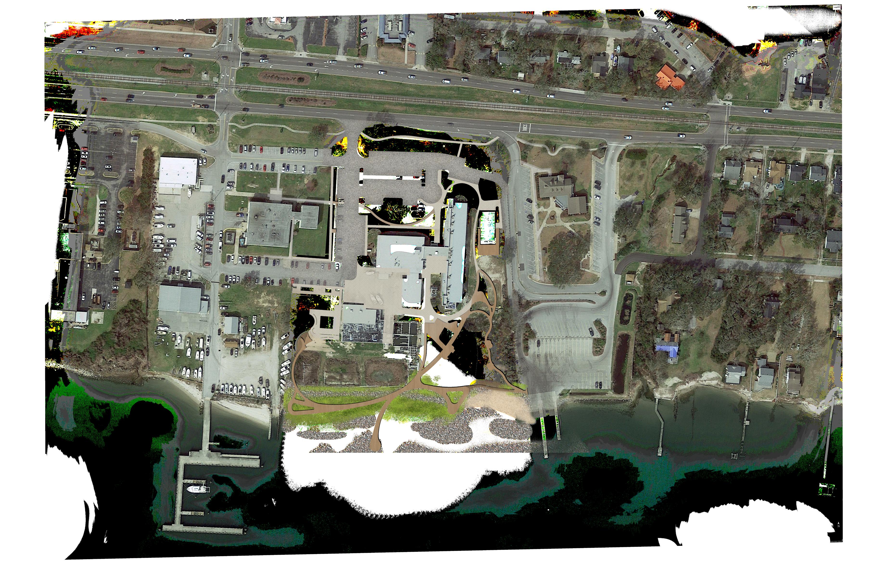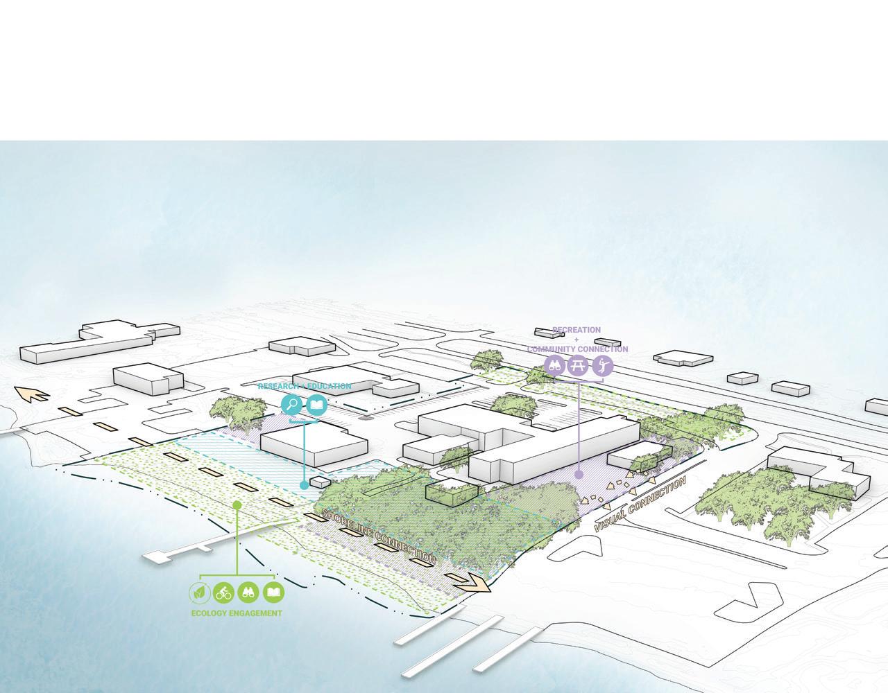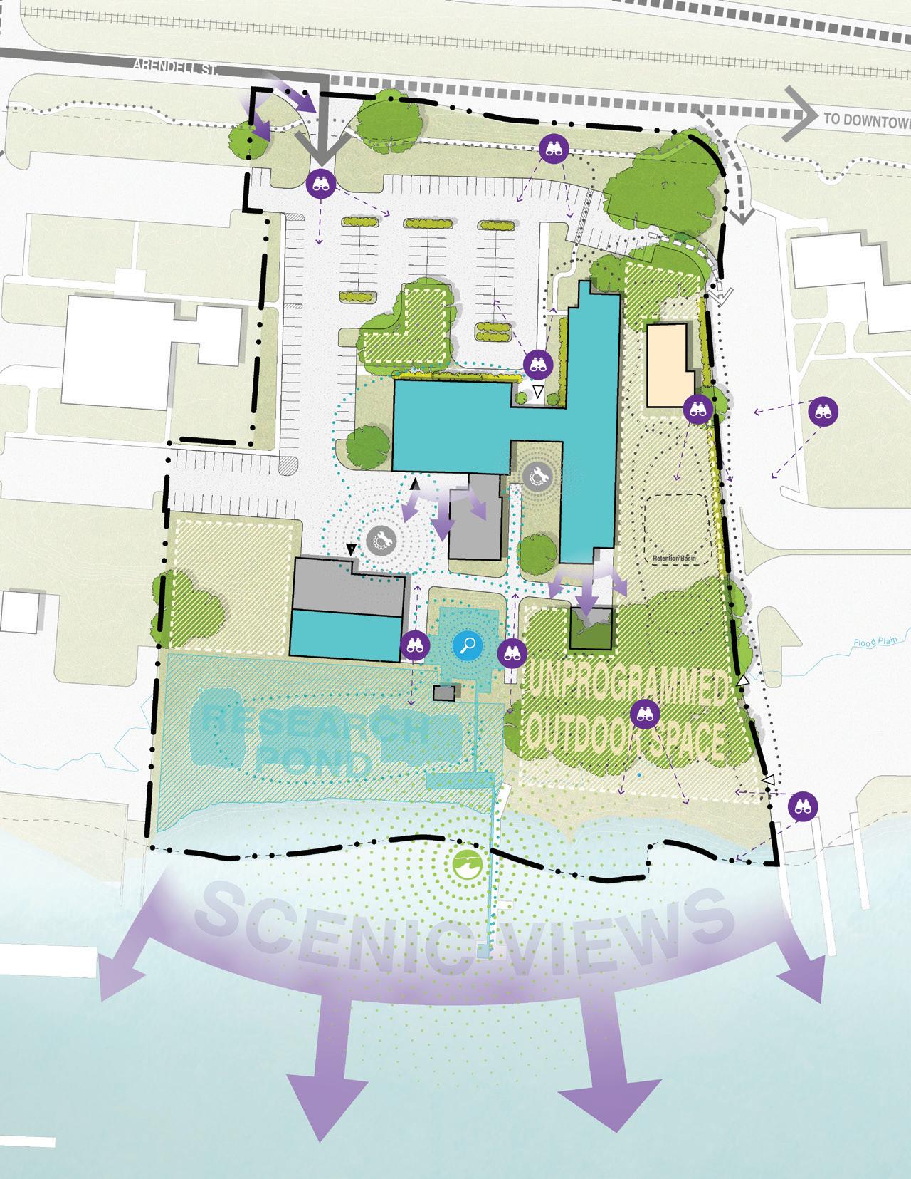 The analysis determined that the east side of the site is ideal for public engagement due to its proximity to the Visitor Center, available un-programmed space, and minimal disruption to research equipment and operations. The area near the wet labs, shop, and maritime forest is wellsuited for educational and research opportunities for both the public and UNC IMS staff. Additionally, the shoreline requires restoration and resilience measures, while the streetscape along Route 70 needs ecological enhancements for stormwater management and improved approachability.