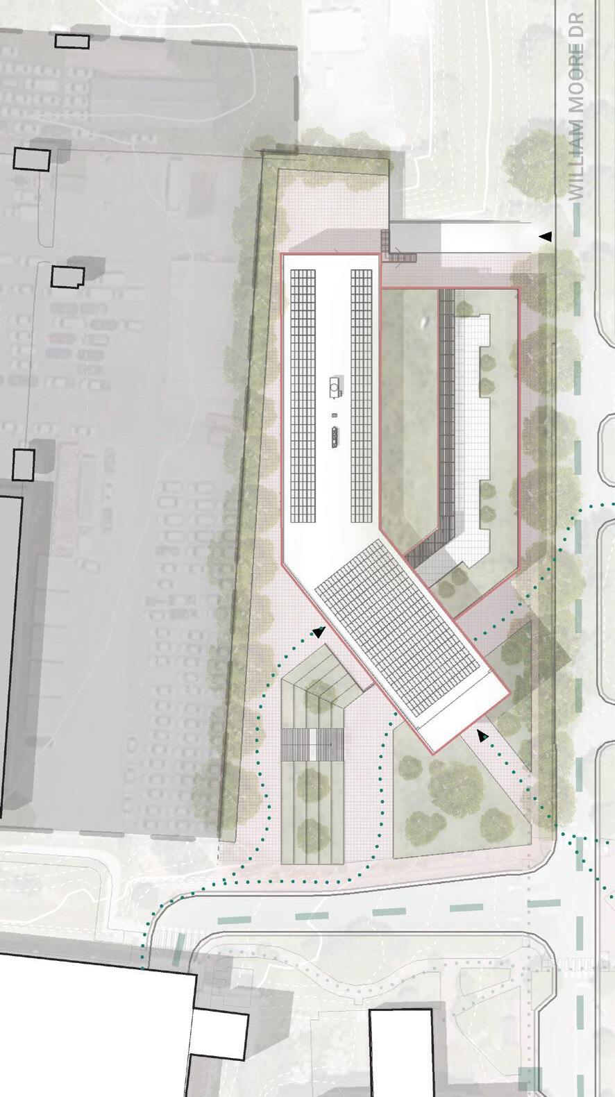 The College of Veterinary Medicine Educational Building serves as a dynamic hub for learning and social connection at North Carolina State University’s Centennial Biomedical Campus. As a prominent gateway from William Moore Drive and Trinity Road, the building enhances campus accessibility while prioritizing walk ability and student engagement. Its design centers around a light-filled atrium that fosters transparency, collaboration, and community. This vibrant space encourages students to gather, study, and connect, creating an inspiring academic environment. The adaptable exterior spaces accommodate future expansion, ensuring long-term flexibility.