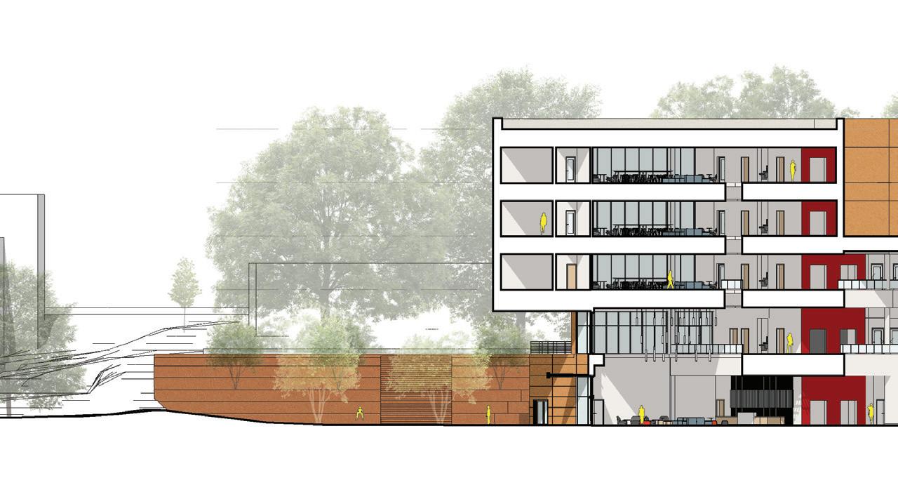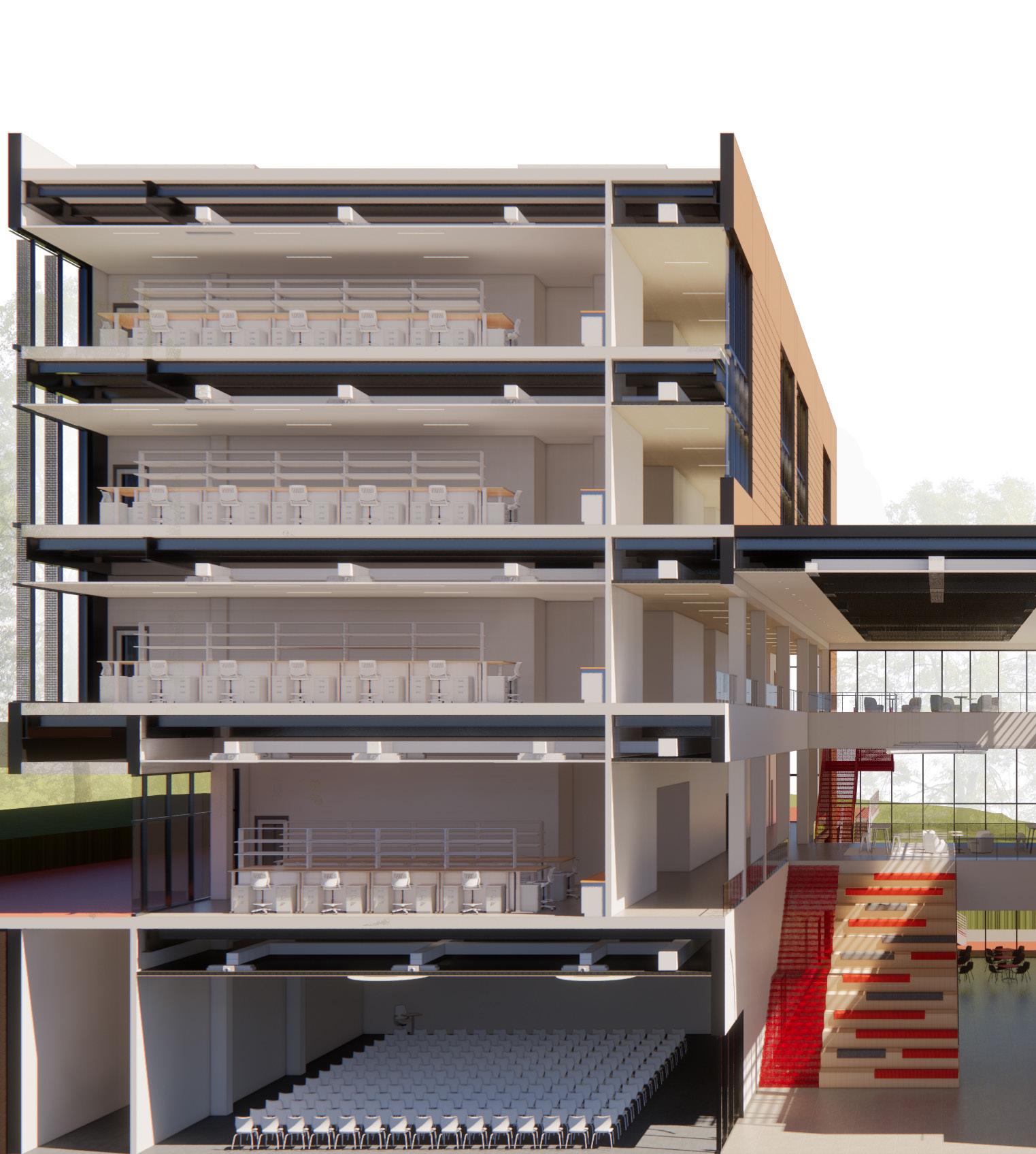 The building’s exterior material palette honors NC State’s architectural heritage, seamlessly integrating warm brick tones with terracotta panels. This timeless aesthetic reinforces the tradition and excellence of the veterinary medicine program while maintaining a strong connection to the campus landscape.