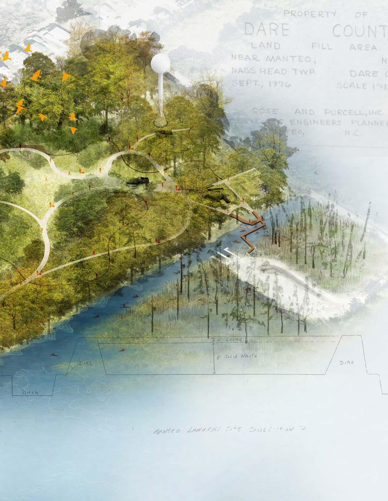 The community has long expressed interest in transforming the site into a public amenity. Using GIS and government data, the broader ecological context was assessed. The landfill sits at one of the highest elevations in Manteo, making it less vulnerable to sea level rise. However, remediation remains essential to protect surrounding wetlands and their high biodiversity.