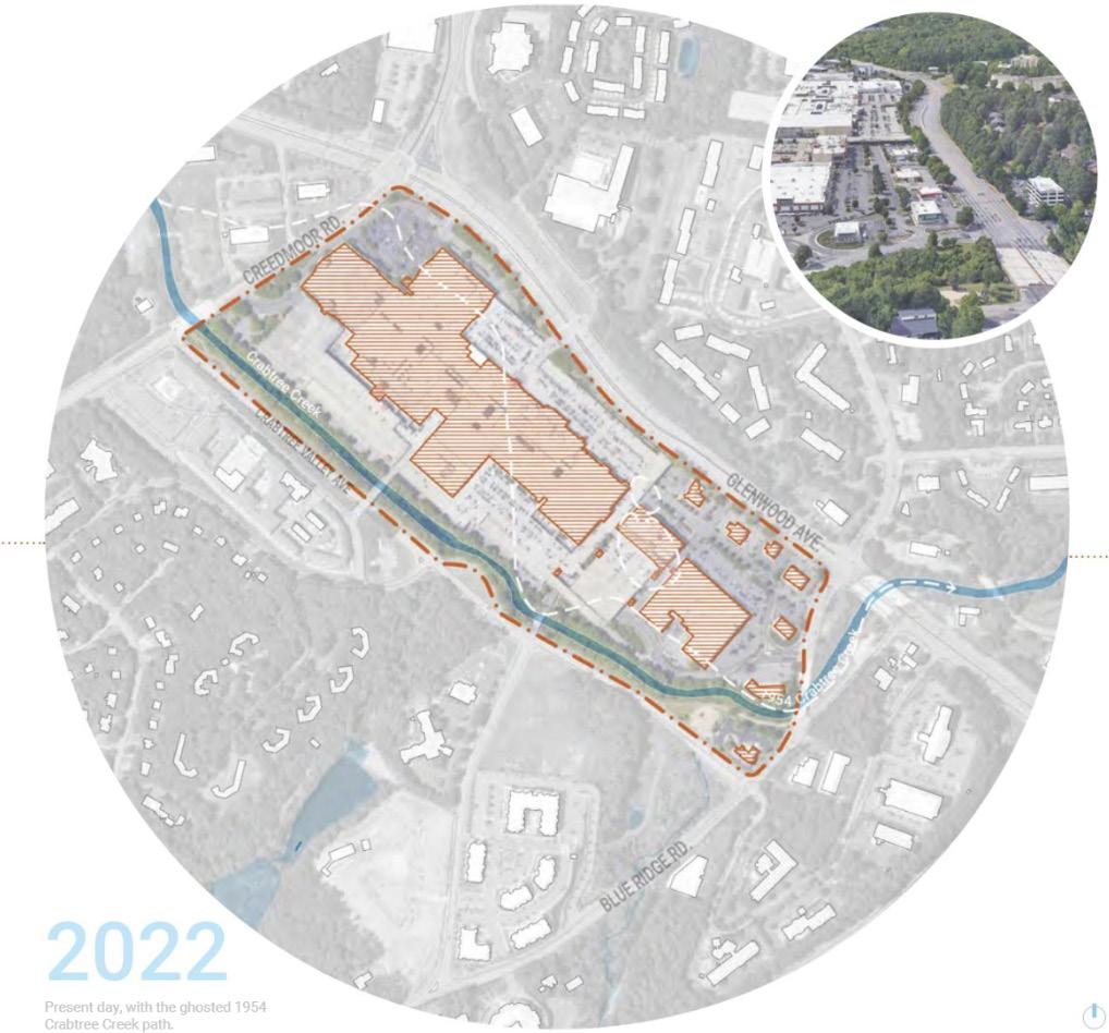 A New Spectacle, a research book by the 2022 Hanbury Summer Scholars (Abhishek Ambekar, Kelly Clark, Shuqi Liu, and Lizandro Marcial-Armas), explores the future of Raleigh’s iconic Crabtree Valley Mall, recently listed for sale after 50 years. Acknowledging the mall’s ecological vulnerability near flood-prone Crabtree Creek, the Scholars envision a sustainable mixed-use development. Their proposal integrates green infrastructure, repurposes existing assets, and emphasizes pedestrian-friendly design. The plan includes residential, commercial, and recreational spaces to serve Raleigh’s diverse community while harmonizing with the natural environment.