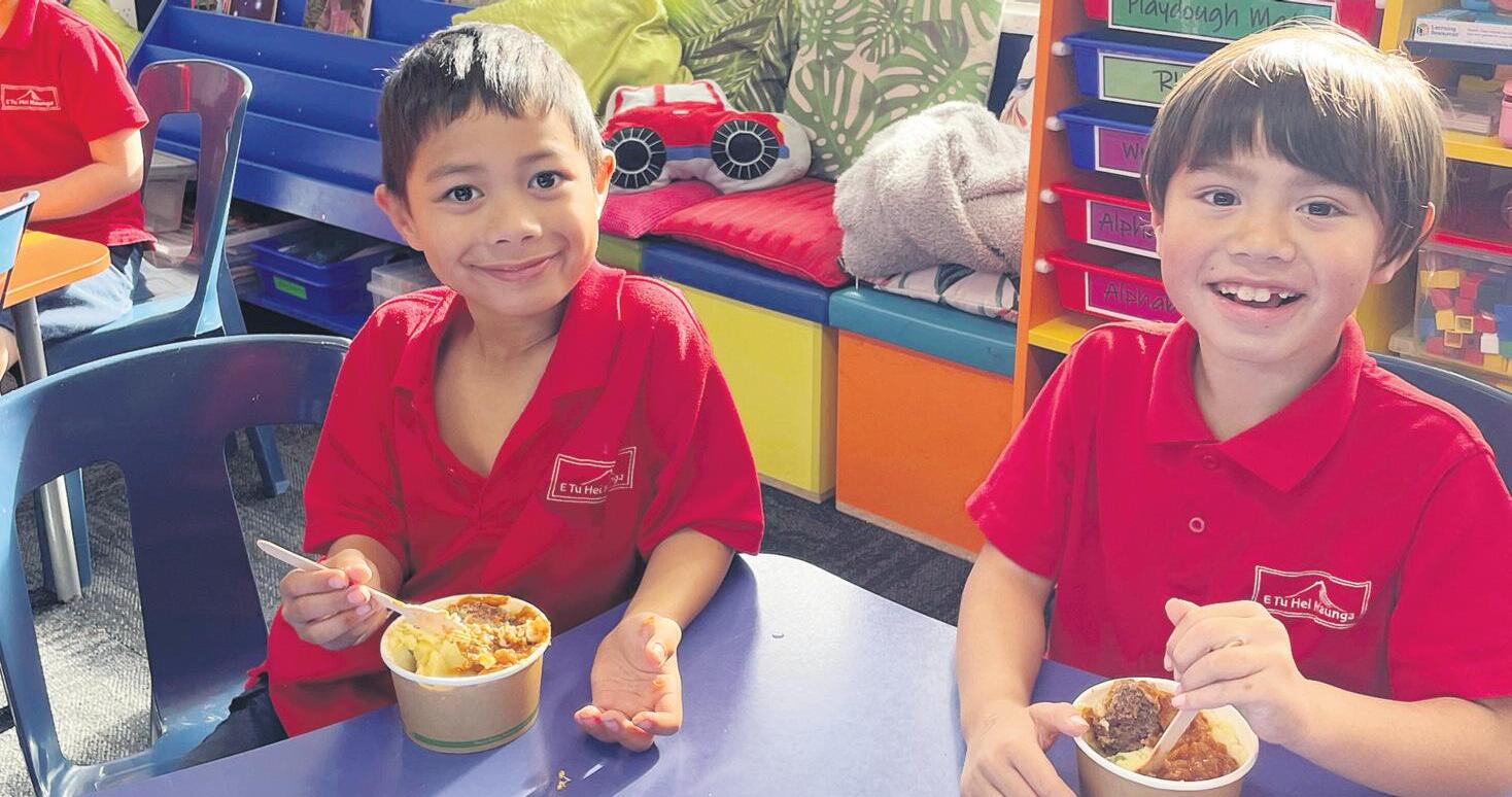 Two students enjoying hot deviled sausages for lunch at Rotorua’s Western Heights Primary School last month PHOTO: Jan Tinetti