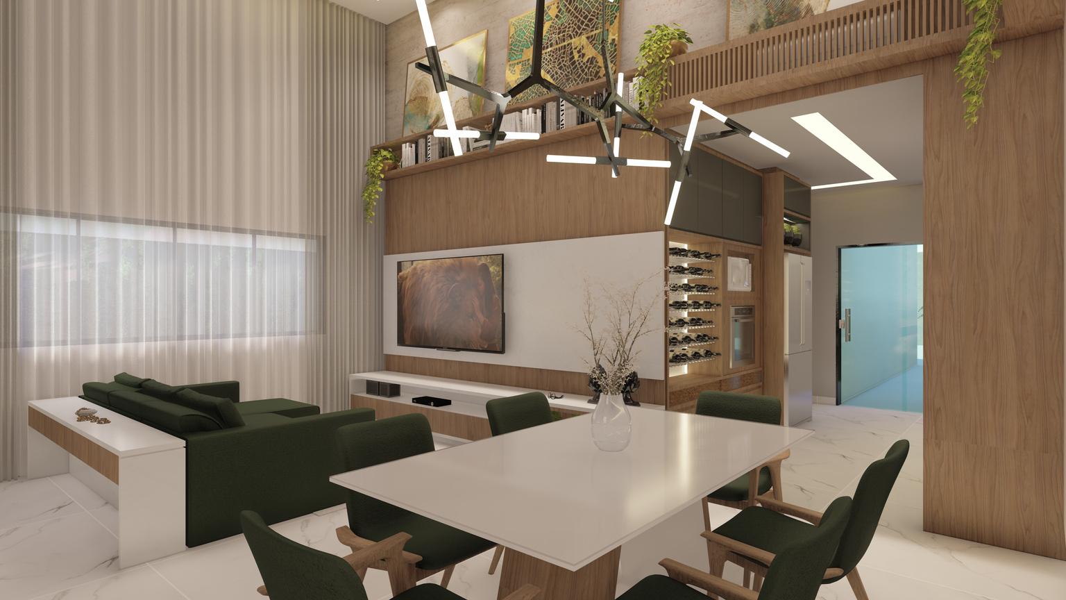 A contratação da empresa ocorreu com intenção de revisão projetual, reestruturação da fachada e projeto de interiores dos segintes ambientes: Sala de Tv integrada com sala de jantar, cozinha, banho social e banho do casal.