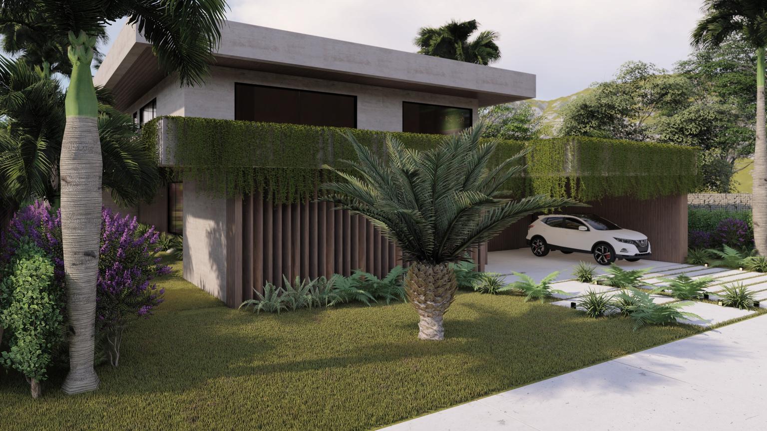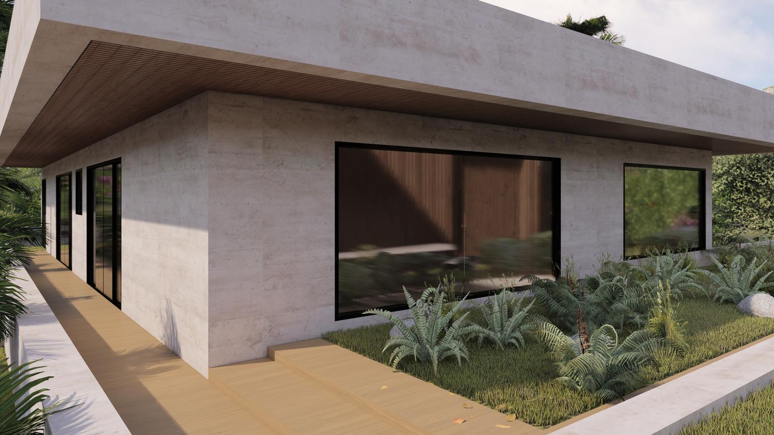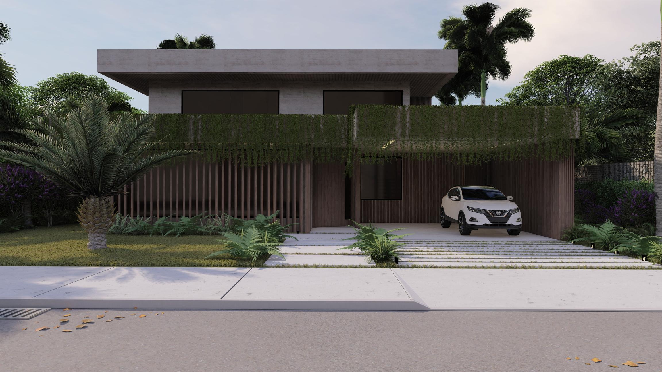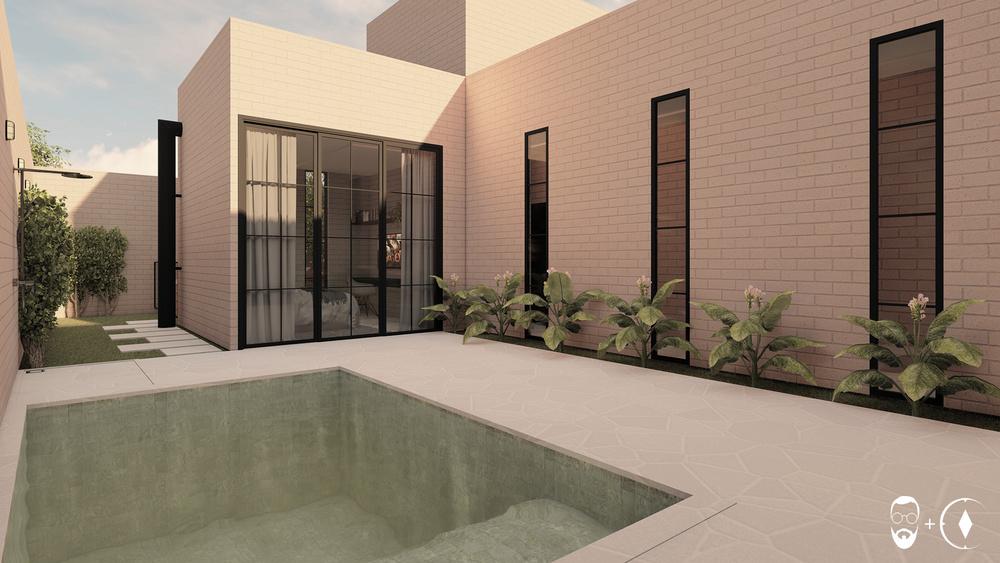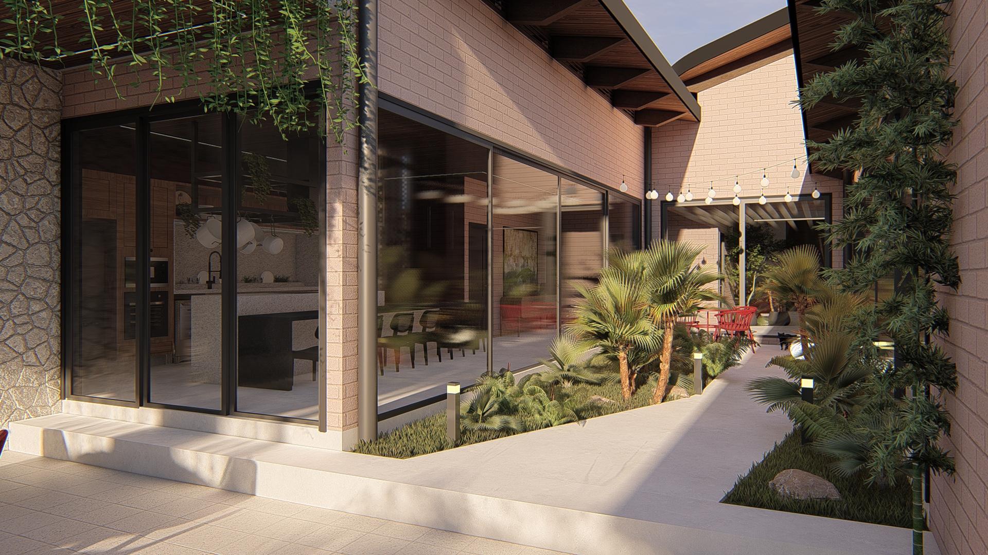 PROJETO: Gabriel Albernaz e Lizandra Martins. RENDER: Lizandra Martins. Localizada em Senador Canedo - GO, o projeto se voltou para funcionalidade e orçamento bem estabelecido por partes dos clientes. A vertente da sustentabilidade aparece nesse projeto não somente como cunho de valores e gostos, mas como forma de baratear a execução ao fazer uso do material que norteou todo o projeto: Tijolo Ecológico.