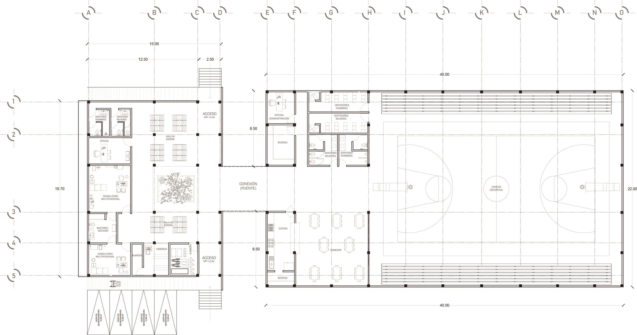 CONFORMADO POR UNA CLÍNICA DE SALUD Y UN CENTRO DEPORTIVO RESUELTO CON DOS VOLÚMENES UNIDOS POR UN PUENTE DE ACERO Y TAMBIÉN AMBOS ENTRADAS INDEPENDIENTES.