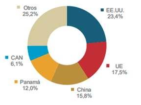 Con respecto a los datos generados del Ecuador, el principal destino de las exportaciones de Ecuador fue Estados Unidos representando 23,4% de sus exportaciones totales, seguido por la Unión Europea con 17,5%, China con 15,8%, Panamá con 12,0% y en quinto lugar los Países Miembros de la CAN con una participación de 6,1% del total.