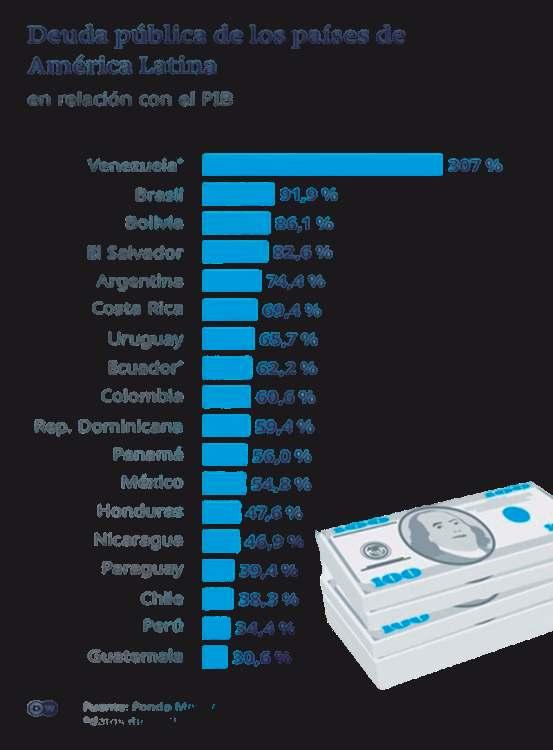 Según las últimas cifras del FMI (ver gráfico), Venezuela es el país de la región con la deuda más alta, con un 307 por ciento en relación con su Producto Bruto Interno (PIB). En el último lugar se ubica Guatemala, que tiene una deuda del 30,6 por ciento en relación con su PIB.
