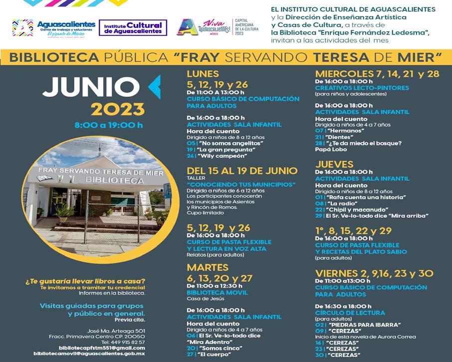 El horario de atención al público es de lunes a viernes de 8:00 a 19:00 horas; como parte de las actividades programadas durante junio hay clases de computación para adultos, sala de lectura infantil “La hora del cuento”, el taller “Conociendo tus municipios”, el curso “Pasta flexible y lectura en voz alta”, así como las visitas guiadas para grupos y público (con cita).
