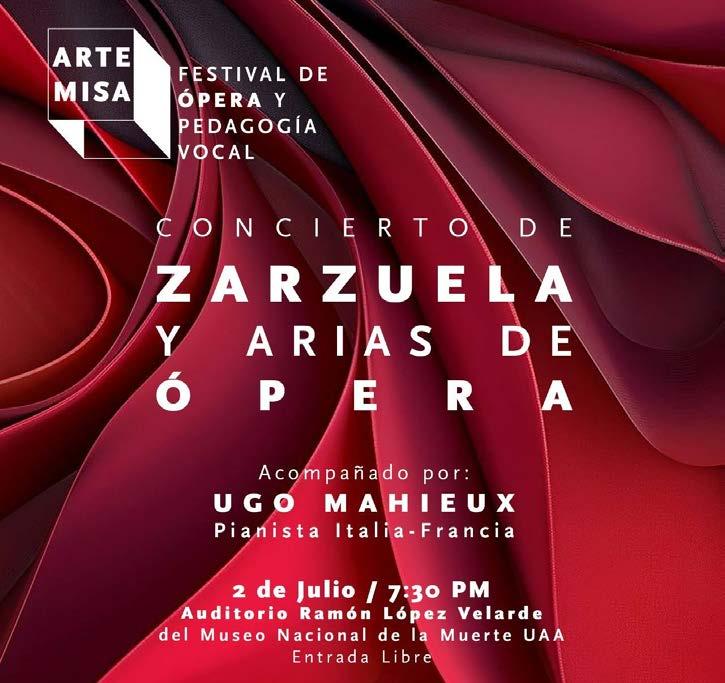 compañía del pianista italo-francés Ugo Mahieux, presentarán un concierto de Zarzuela y arias de ópera en el Auditorio “Ramón López Velarde” del Museo de la Muerte de la Universidad Autónoma de Aguascalientes.