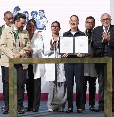 Al finalizar la conferencia de prensa, la jefa del Ejecutivo Federal firmó el decreto de incorporación del Programa IMSS Coplamar al Régimen Ordinario del IMSS, acompañada de directoras y directores de los hospitales rurales, así como coordinadoras y coordinadores de zona.