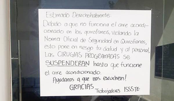 Los médicos cerraron estos espacios en protesta, al no recibir ninguna respuesta de las autoridades del hospital general del ISSSTE en Aguascalientes para la reparación del aire acondicionado en los quirófanos