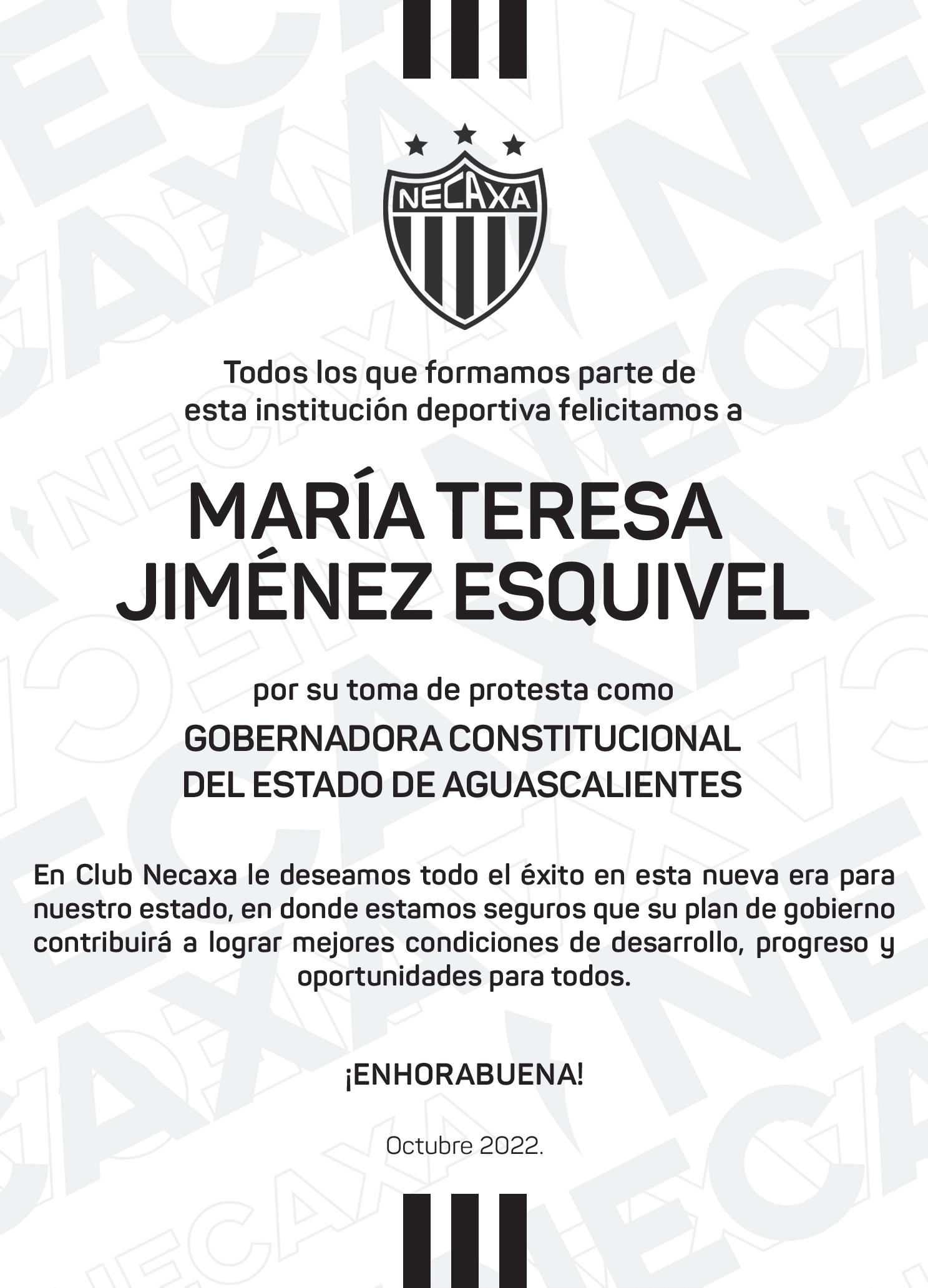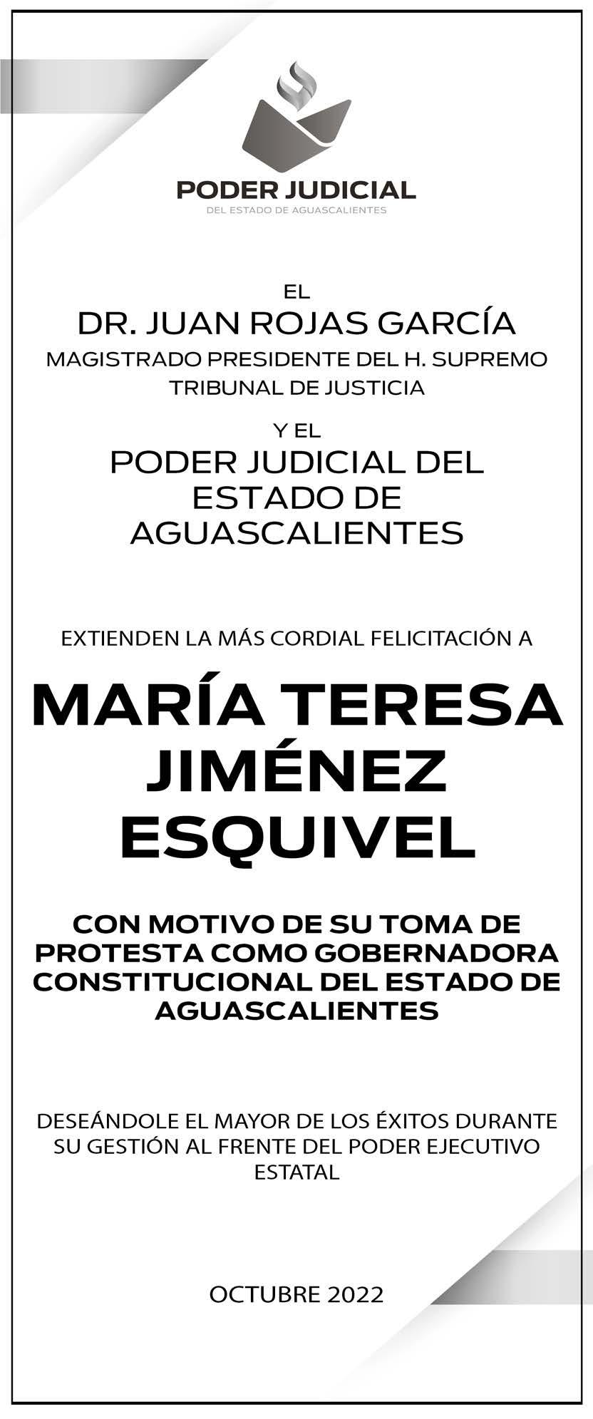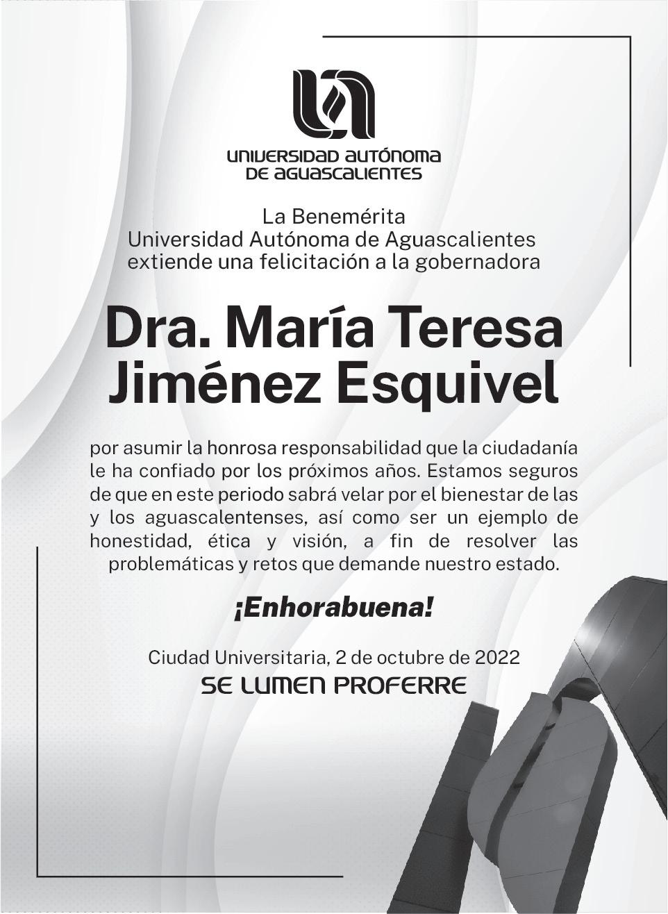 Hagamos que Aguascalientes, lata fuerte, porque tiene ante sí, un futuro extraordinario. El reto es grande, pero no imposible. ¡Lo vamos a lograr! ¡Y que viva Aguascalientes! Teresa Jiménez, gobernadora (2022-2027)