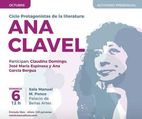La Secretaría de Cultura del Gobierno de México y el Instituto Nacional de Bellas Artes y Literatura (INBAL), a través de la Coordinación Nacional de Literatura (CNL), rendirá homenaje a la narradora y ensayista Ana Clavel, dentro del ciclo Protagonistas de la Literatura , el cual se llevará a cabo el domingo 6 de octubre a las 12:00 h en la Sala Manuel M. Ponce del Palacio de Bellas Artes.