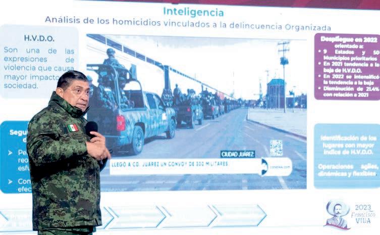 La Secretaría de la Defensa Nacional, encabezada por el general Luis Cresencio Sandoval González, reporta a 98 mil 860 elementos que contribuyen a la Estrategia Nacional de Seguridad, al fortalecimiento de aduanas, a las operaciones para el combate del mercado ilícito de combustible, a la vigilancia del territorio espacio aéreo nacional, a la erradicación de plantíos ilícitos y a la seguridad de instalaciones estratégicas.