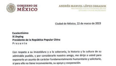 / Dalila escobarEl presidente Andrés Manuel López Obrador envió una carta a su homólogo de China, Xi Jinping, para pedirle que se controle el envío de fentanilo desde su país a México, como ayuda y en respuesta a las iniciativas de legisladores se Estados Unidos, a las que consideró “groseros amagos” que buscan, con sus fuerzas armadas, invadir territorio mexicano.
