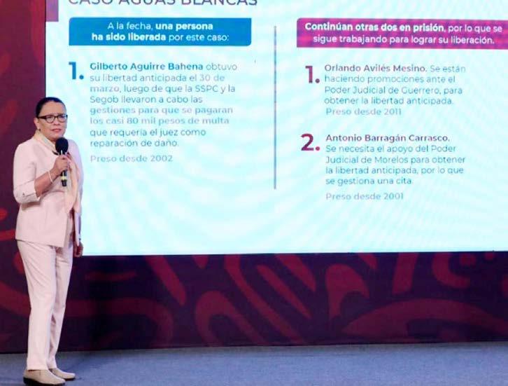 Comité de Amnistía. Por el caso de Aguas Blancas, Gilberto Aguirre Bahena obtuvo su libertad anticipada el 30 de marzo, luego de que las secretarías de Seguridad y Protección Ciudadana y la de Gobernación gestionaron el pago de casi 80 mil pesos de multa que requería el juez como reparación de daño. Continúan otras dos personas en prisión, por lo que continúa el trabajo para lograr su liberación; se trata de Orlando Áviles Mesino y Antonio Barragán Carrasco.