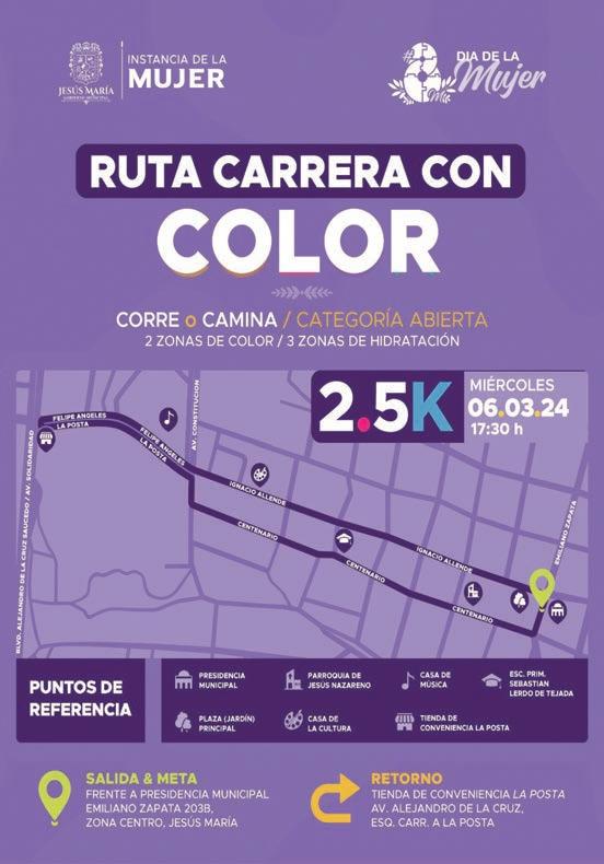 En el marco del Día de la Mujer, la Secretaría de Seguridad Pública y de Vialidad del municipio de Jesús María informa a la ciudadanía que el miércoles 6 de marzo habrá cierres viales con motivo de la Carrera con Color por los Derechos de la Mujer.