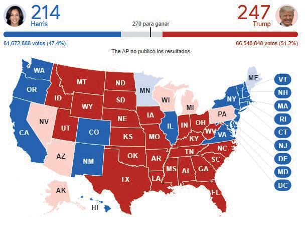 Empezaron a llegar los resultados de las elecciones presidenciales de Estados Unidos, el ganador requiere de 270 votos de consejeros electorales para poder ganar, al momento en el que estamos redactando esta columna, los resultados favorecen a Donald Trump, con 19 votos contra 3 de Kamala Harris, de seguir la tendencia, el triunfo de Trump es inminente. la del estribo Los municipios se preparan para entregar la siguiente semana sus leyes de ingresos ante el Congreso del Estado, el cual será el encargado de estudiar, analizar y votar las propuestas de los ayuntamientos para el ejercicio fiscal próximo.